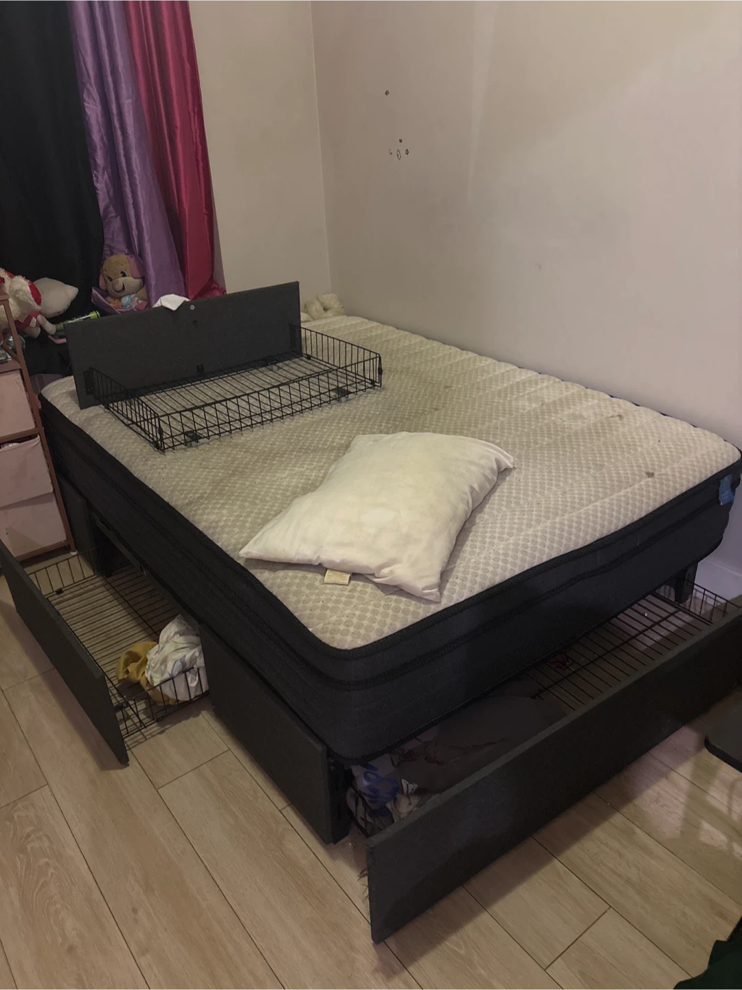 Selling a bed frame that comes with a mattress and built-in drawers! It's a great setup for maximizing storage space in your bedroom. All four drawers in good condition. If you don’t want the mattress that’s fine, we’ll deduct the price.