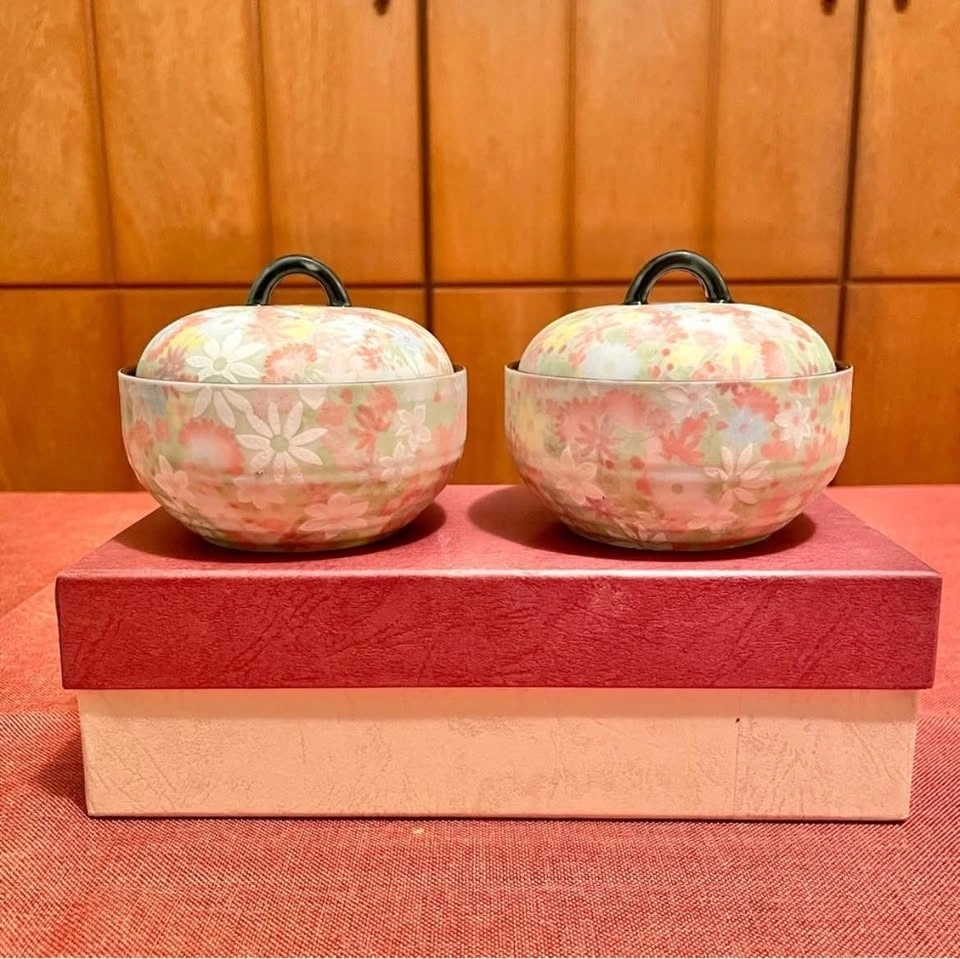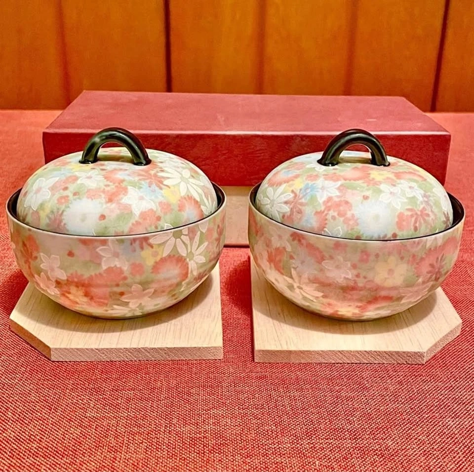 Ryoho Kiln (龍峰窯) Pair of Lidded Bowls with Floral Design