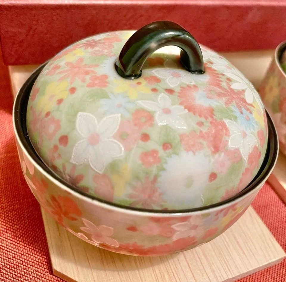This gorgeous pair of lidded bowls from Ryoho Gama features a dreamy watercolor style floral pattern in soft pastel pink, green, yellow, and white. Made of Japanese ceramic with a matte, sand textured finish.