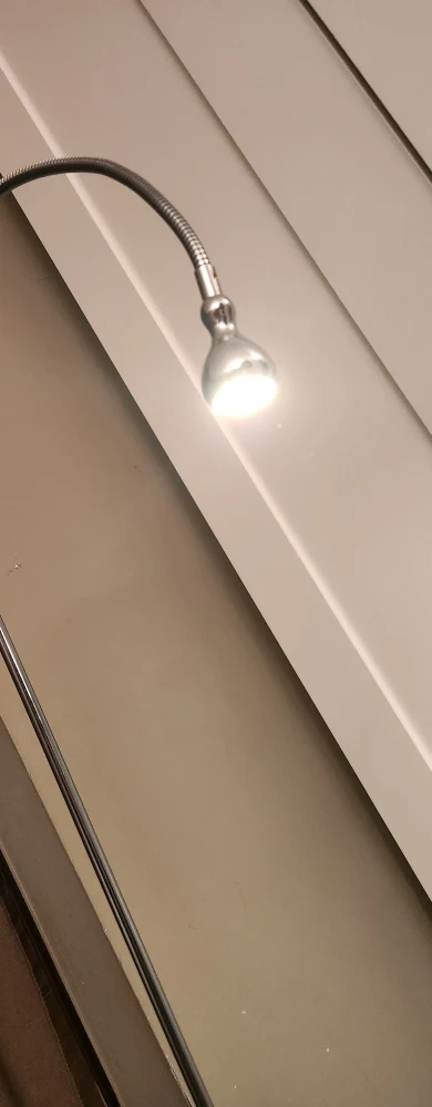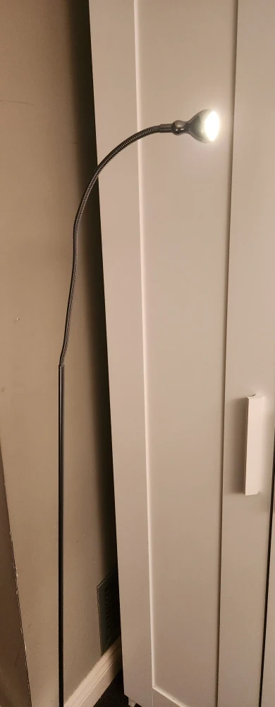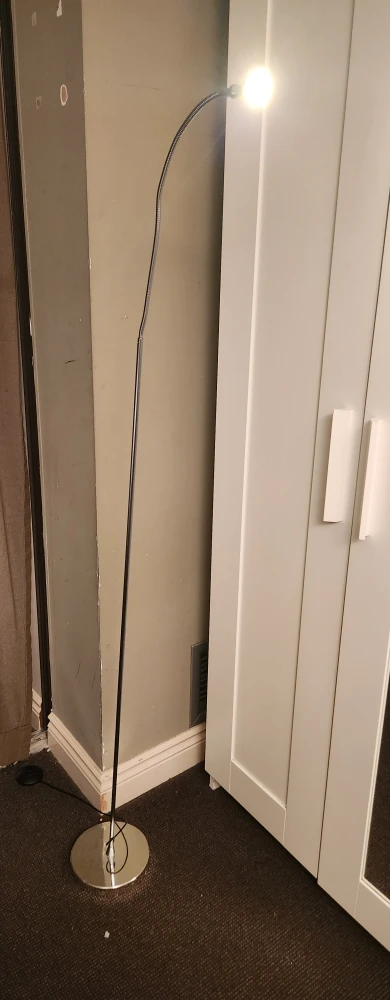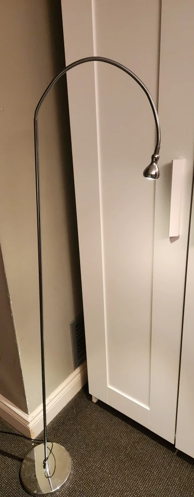 Selling a silver floor lamp in good condition. It has a flexible neck so you can adjust the light where you need it. Great for reading or adding some extra light to a room