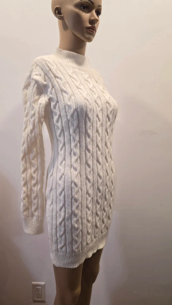 Super stretchy Cozy and stylish cable knit sweater dress in a lovely white colour! The open back design adds a touch of flair to this classic piece. Perfect for staying warm and fashionable