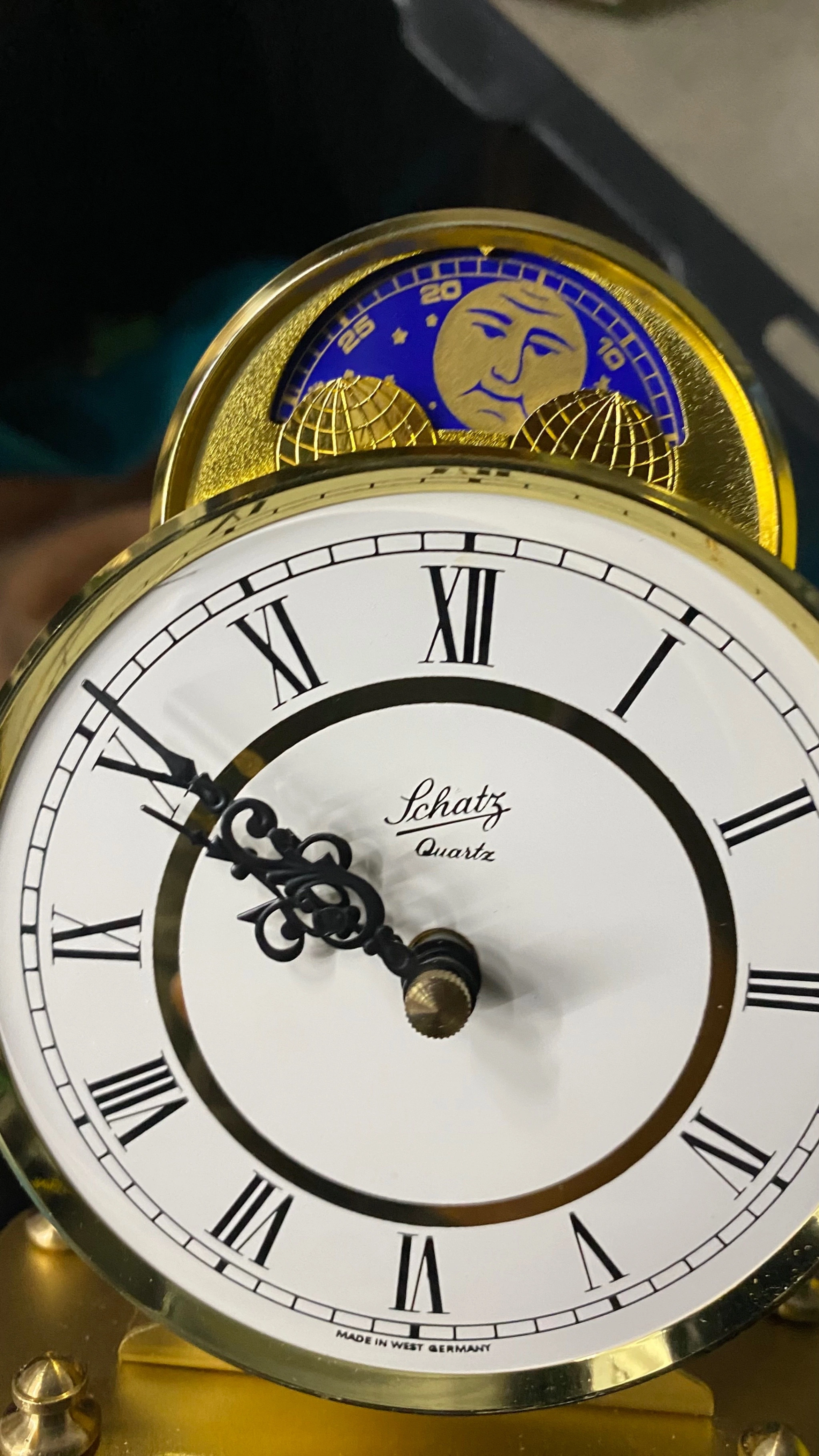 Selling a vintage Schatz Quartz anniversary Dome Mantle clock with Moon Phase. It's a beautiful piece with a classic design. The clock face features Roman numerals, and there's a moon phase indicator at the top. It would make a lovely addition to any home!