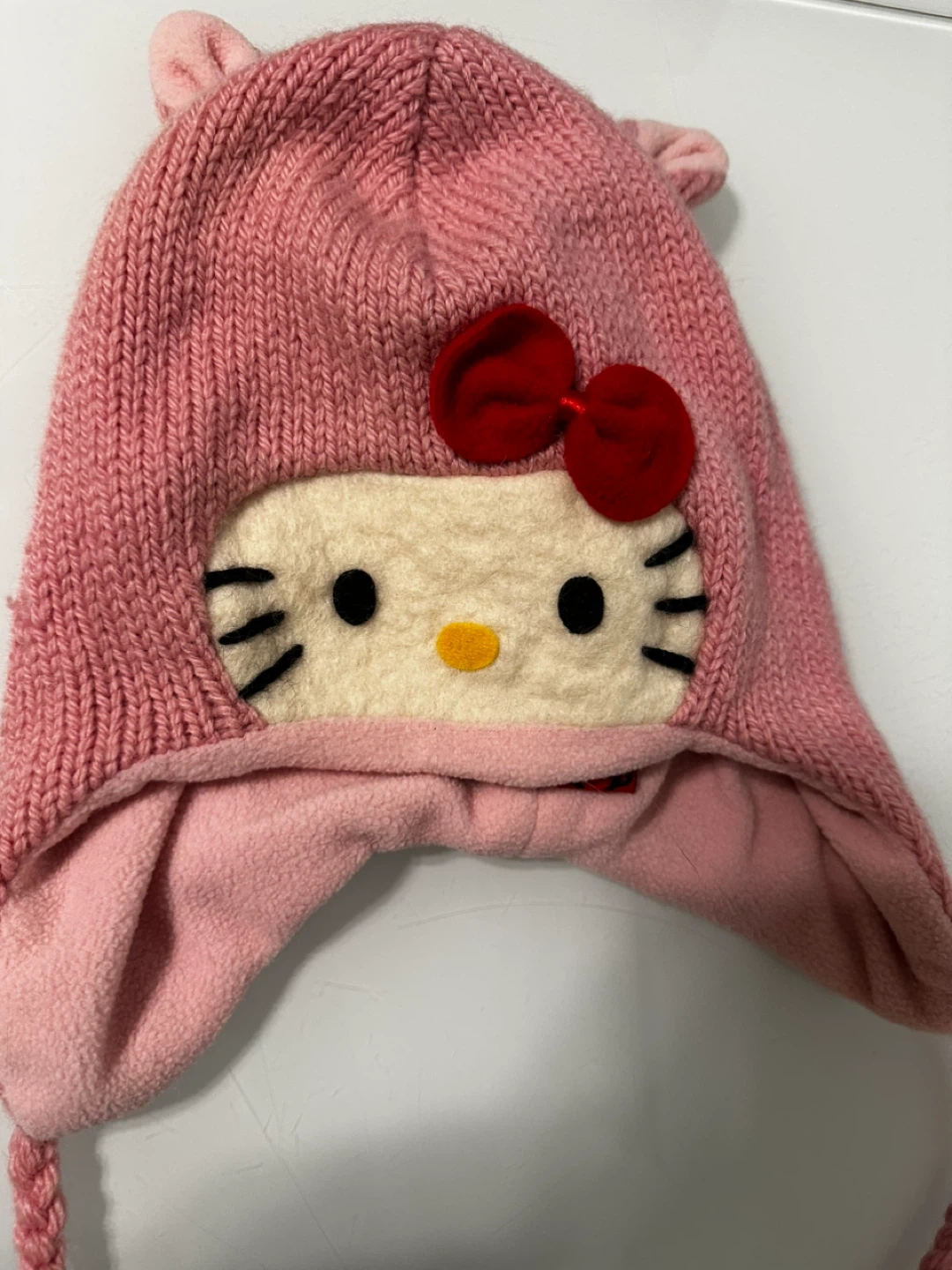Super cute Hello Kitty knitted winter hat! It's pink and features Hello Kitty's face on the front. The hat is made of 100% wool and has a 100% polyester lining. It's handmade and in great condition! For adult