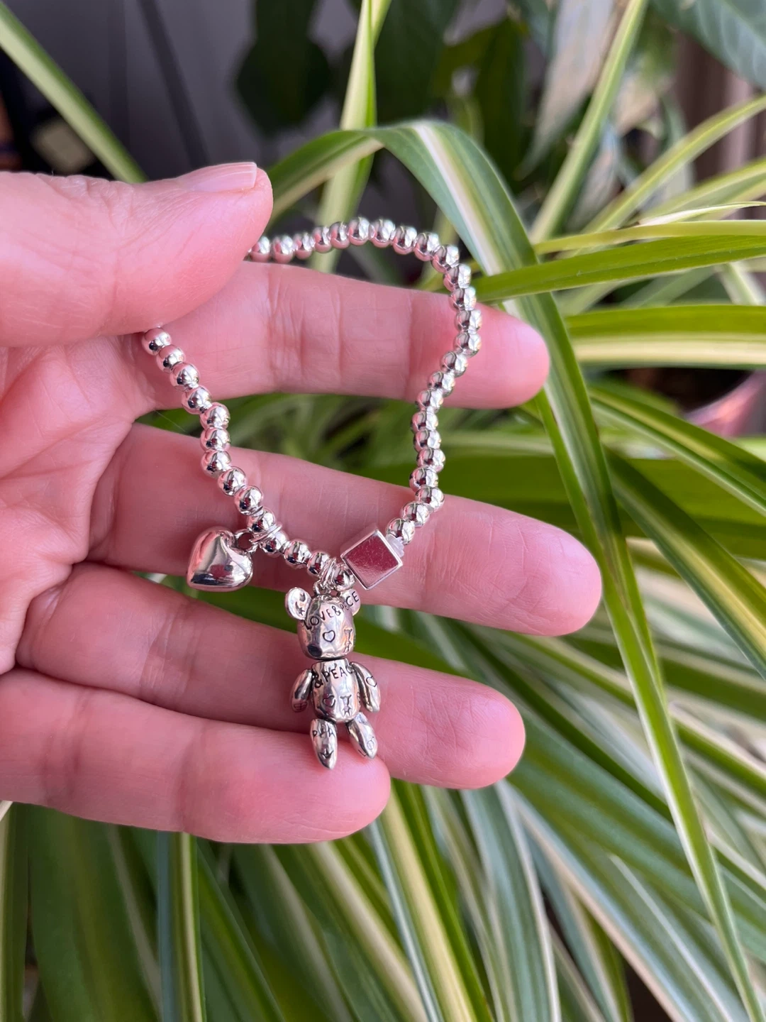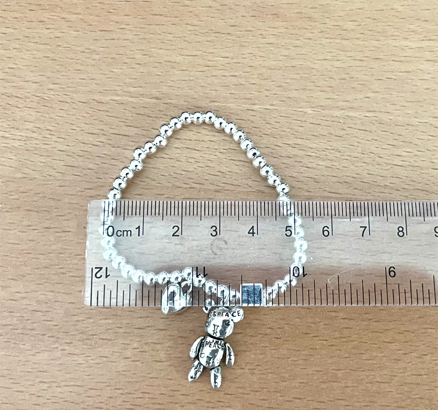 This is a cute silver beaded bracelet with a teddy bear and a heart charm . Slightly stretchy