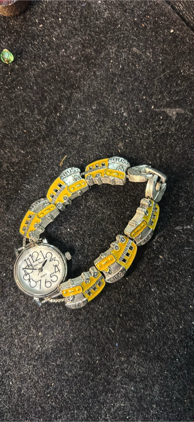 Here's a cute Time Piece watch with a unique yellow school bus design on the band! It's in good condition and ready to add some fun to your wrist