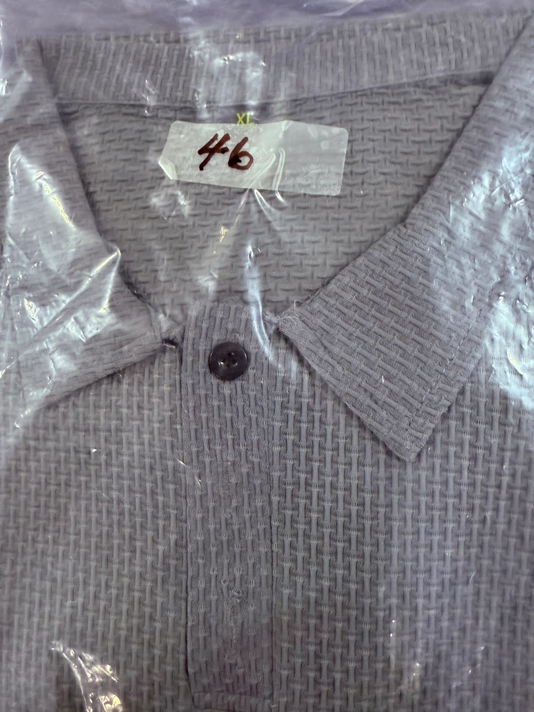 Selling a gray textured polo shirt in size XL. It's in great condition and has a unique woven pattern. Perfect for a casual yet stylish look!