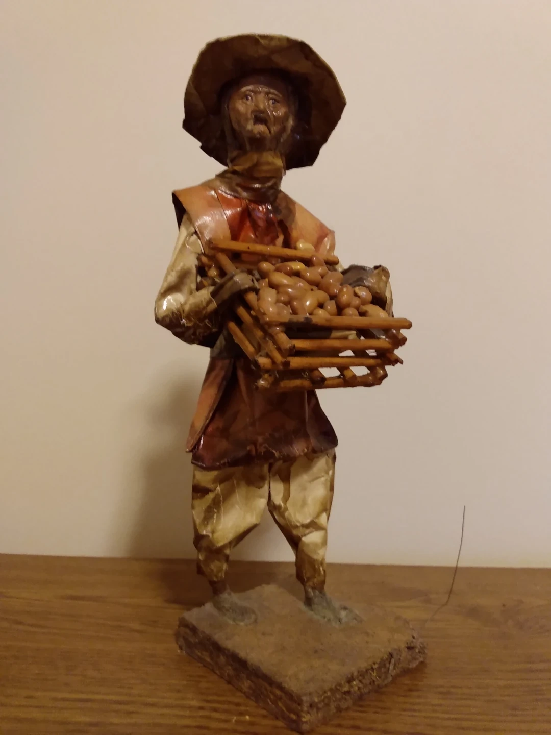Selling a vintage Mexican folk art . This unique piece depicts a man holding a basket, handcrafted with intricate details and a rustic charm. It would be a great addition to your collection or a lovely decorative item for your home!