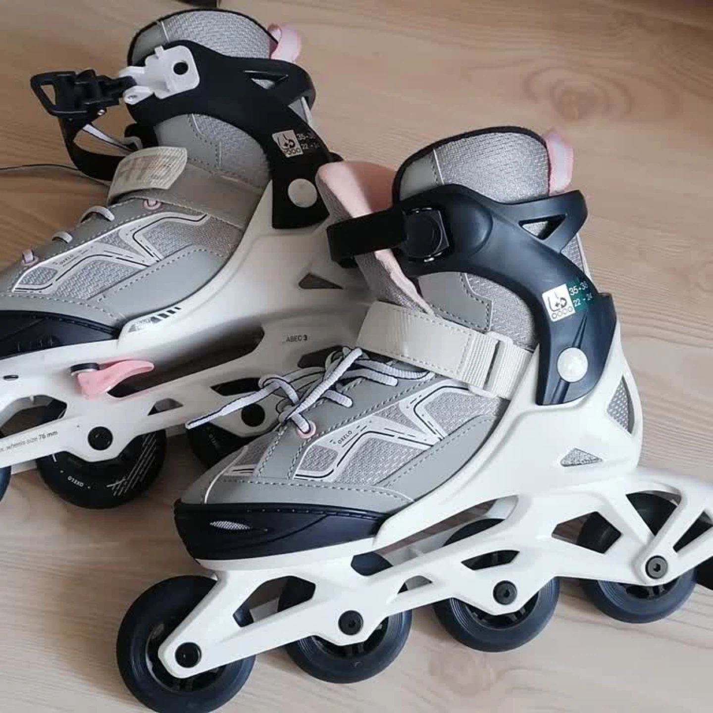 These Oxelo inline skates are in great condition and ready for some fun! They are adjustable from size EU 35-38, which is approximately a US size 4 to 8. The skates feature ABEC 3 bearings and max wheel size of 76mm. Perfect for those learning to skate or enjoying recreational skating!