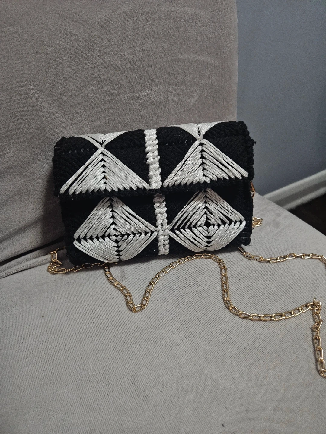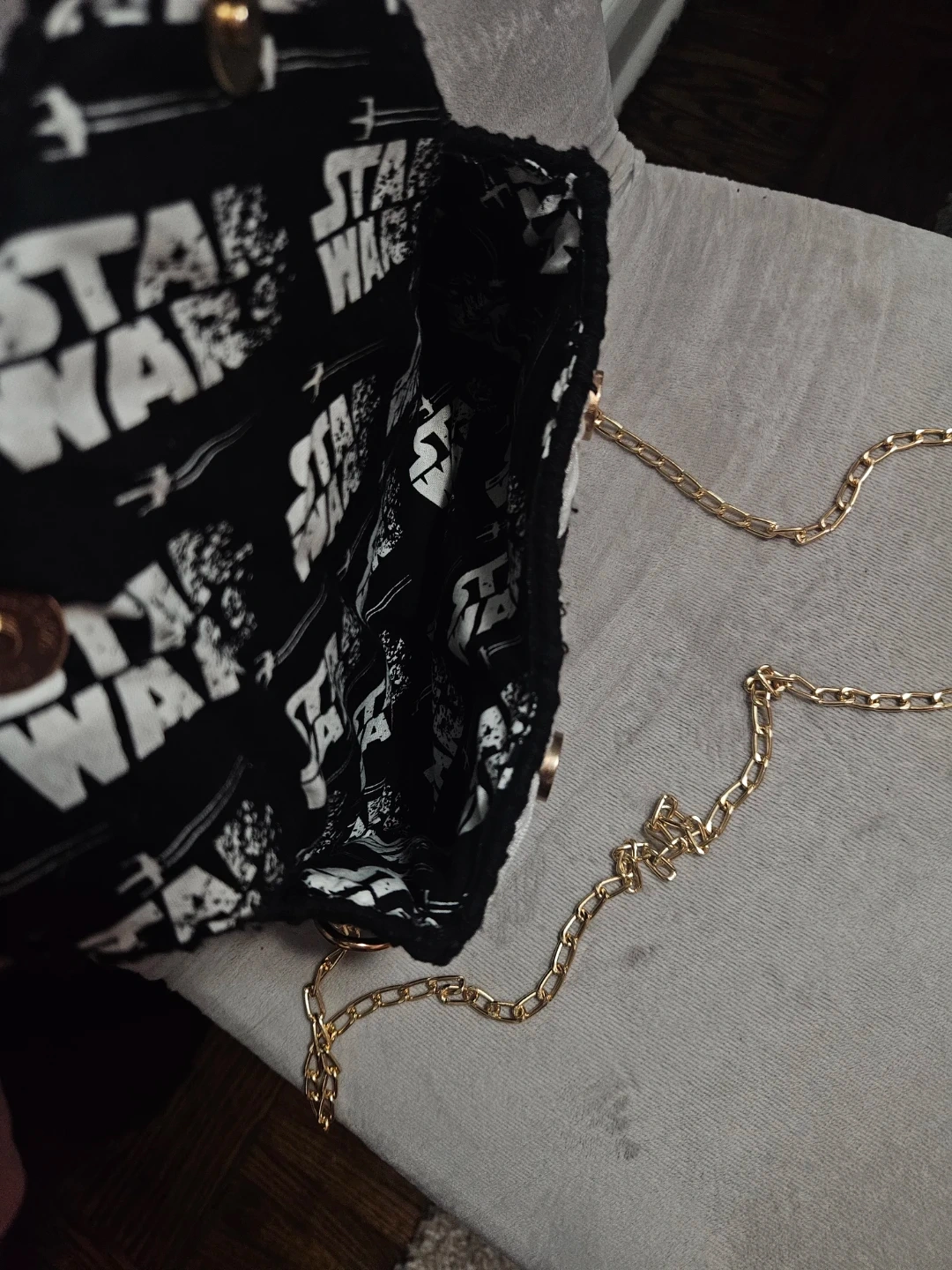 This is a lovely handmade crochet bag in black and white with a gold chain strap. The interior lining features a fun Star Wars print!