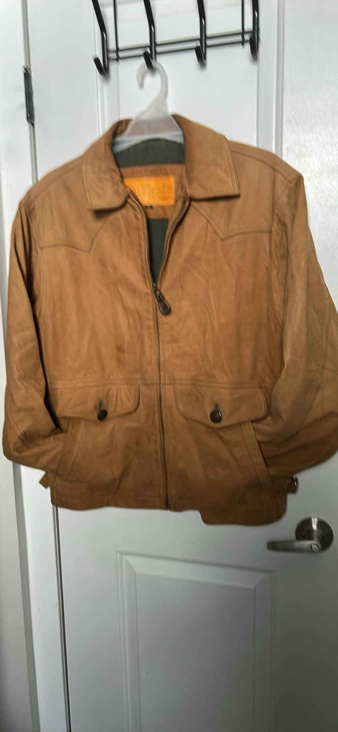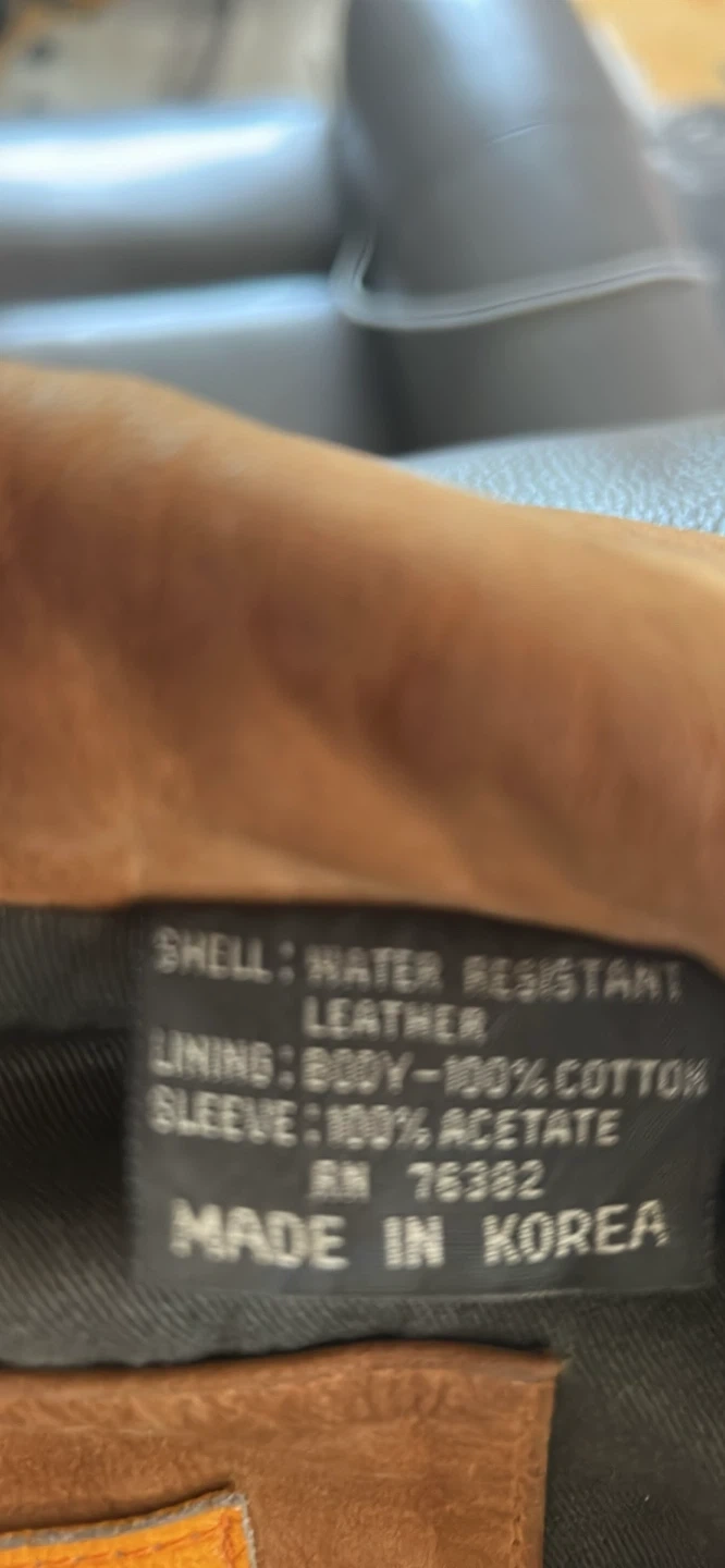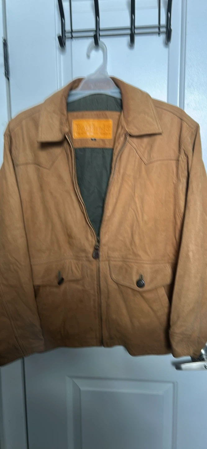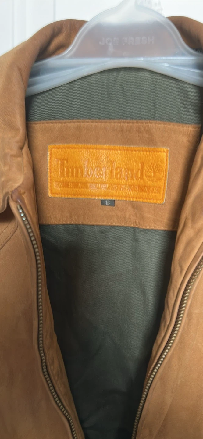 Here's a VINTAGE Timberland leather jacket in a size small. The shell is water-resistant leather, and the lining is 100% cotton for the body and 100% acetate for the sleeves.