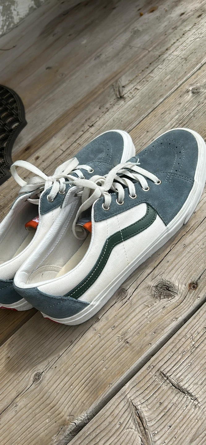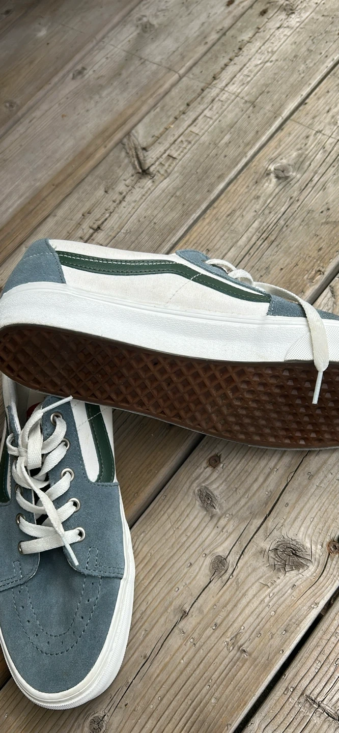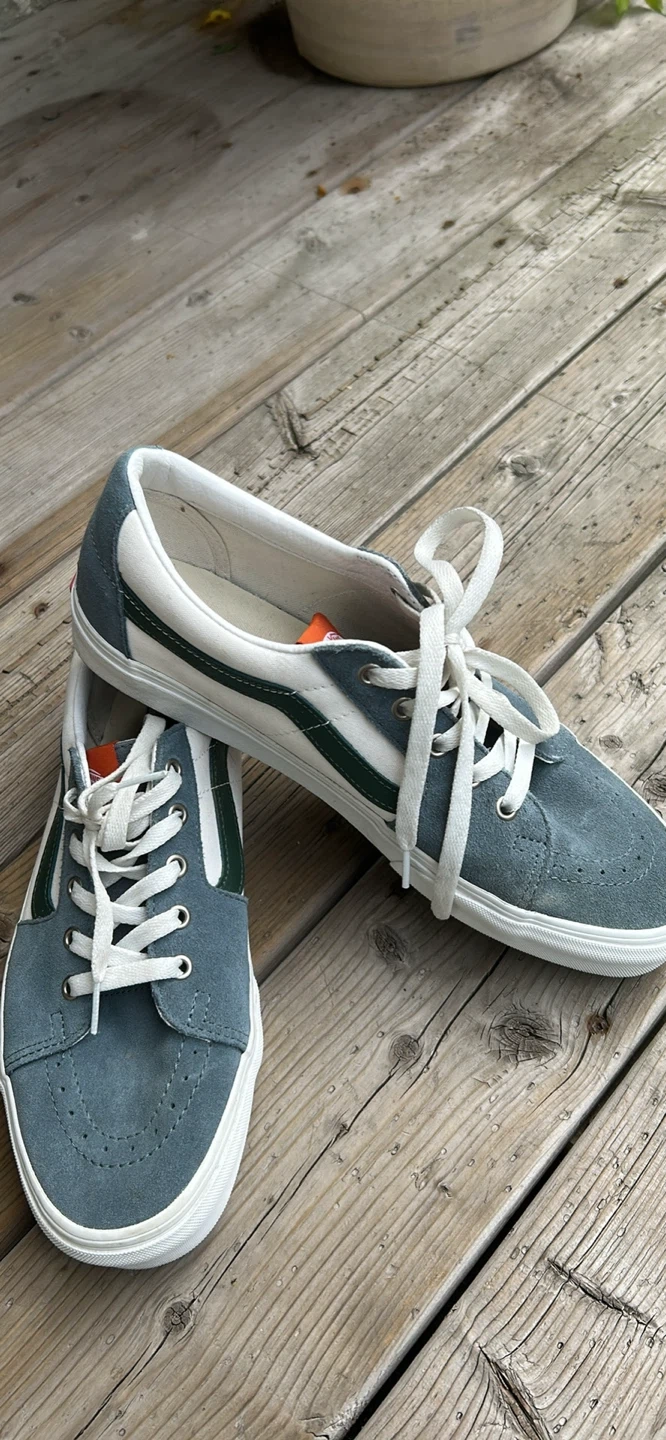 Selling a pair of Vans skate shoes in great condition! They feature a suede upper in a nice blue-grey colour with white and green accents. Size is US 8.5. Perfect for skating or just casual wear!