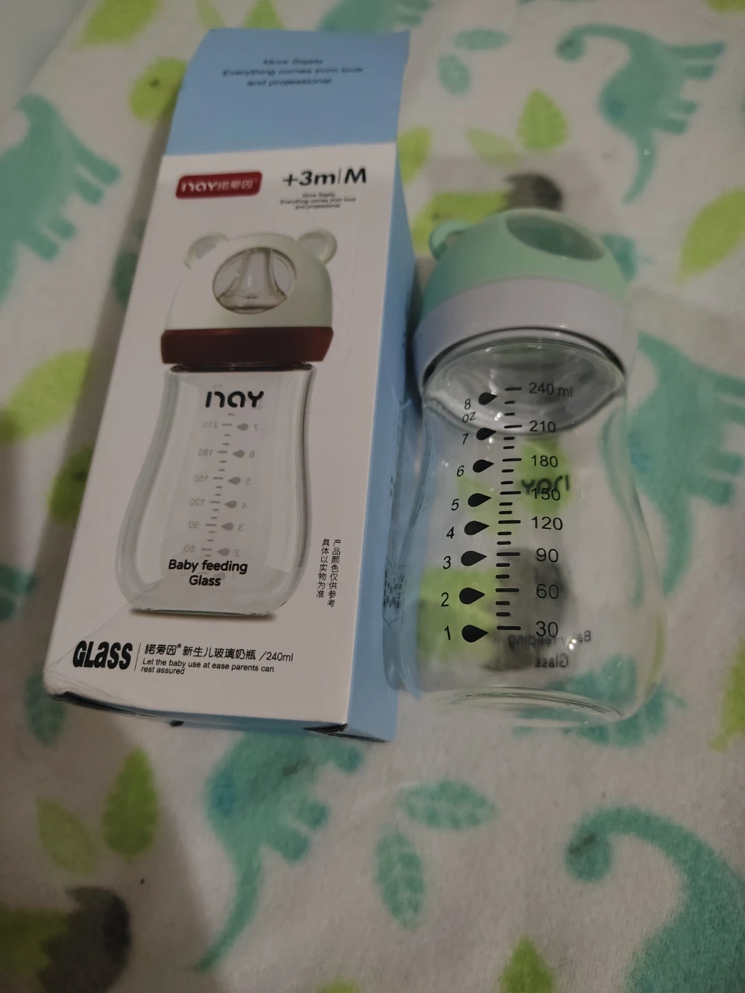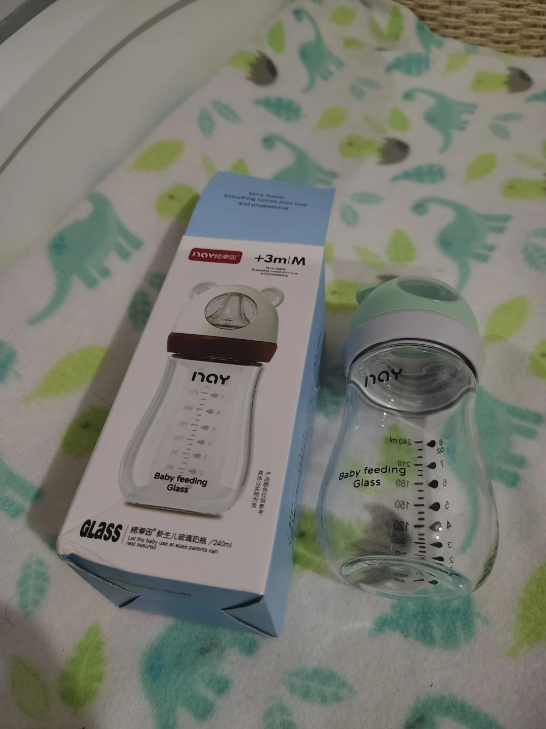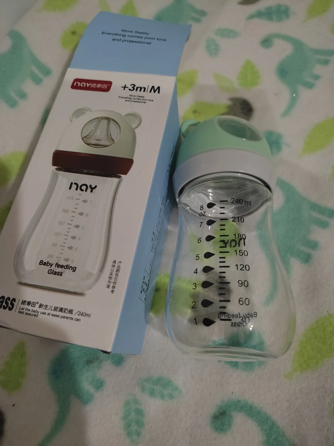 I'm selling a NAY baby feeding glass bottle. It's a 240ml bottle suitable for babies +3 months. Glass baby bottles are a much more environmentally friendly option than plastic ones. The bottle is made of glass and comes with its original box
