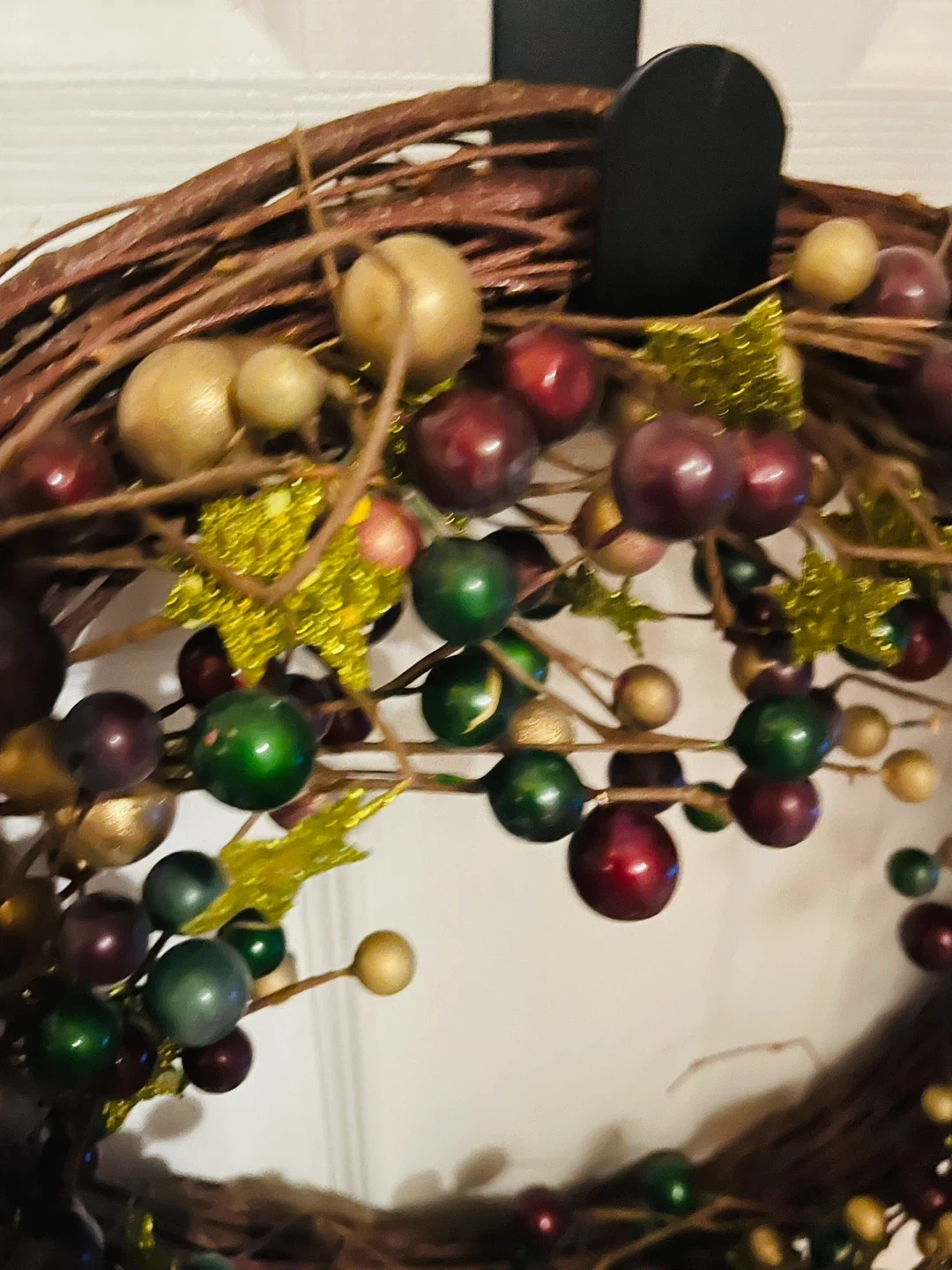 Can be used for all winter long, not just Christmas. It’s a lovely decorative wreath with berries. It would be perfect for adding a touch of charm to your home. The wreath features a variety of colourful berries and twigs.