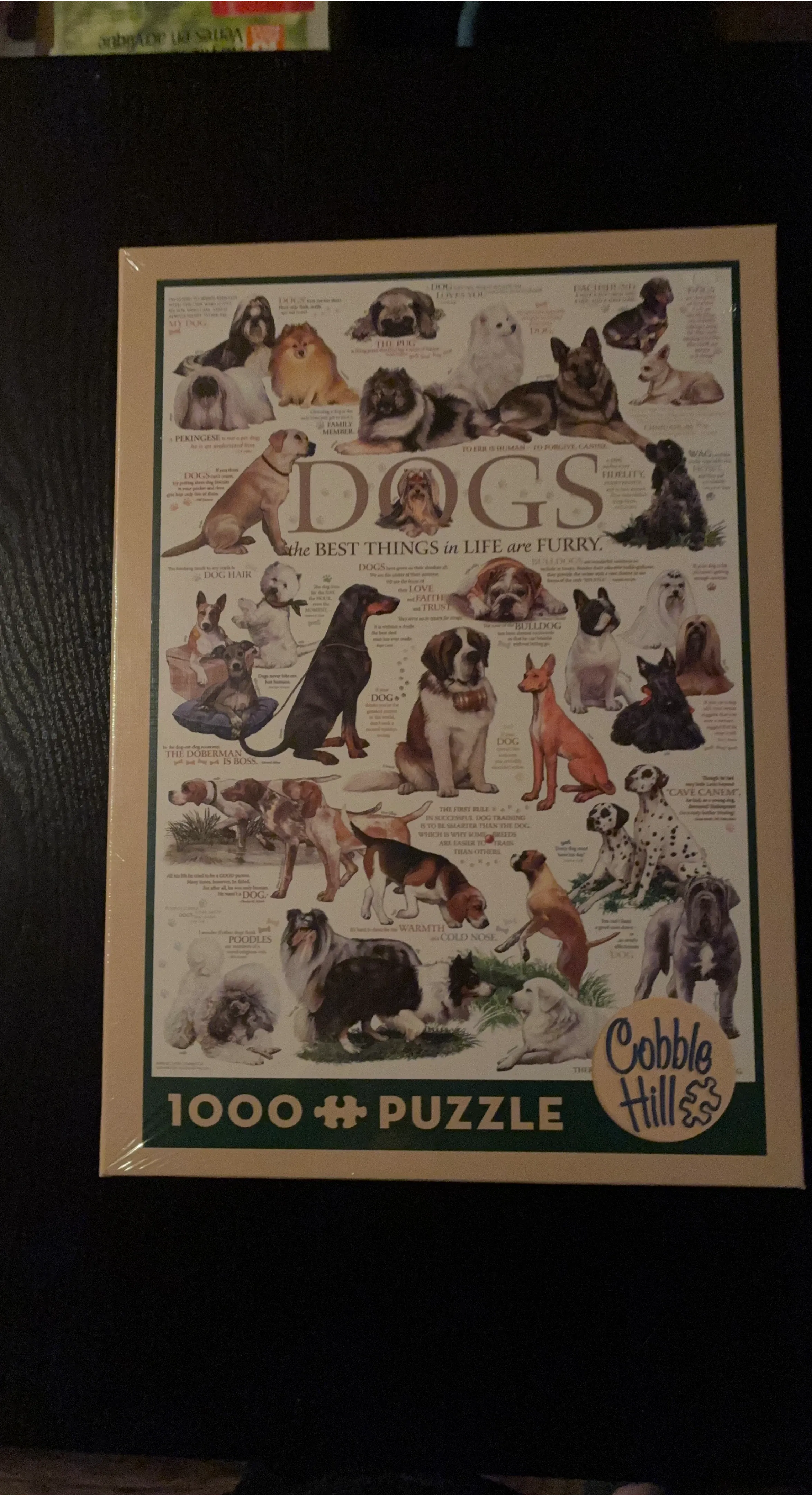 I'm selling a brand new, sealed Cobble Hill 1000-piece puzzle featuring different dog breeds! It's called "Dogs: The Best Things in Life are Furry" and would be a fun activity for any dog lover