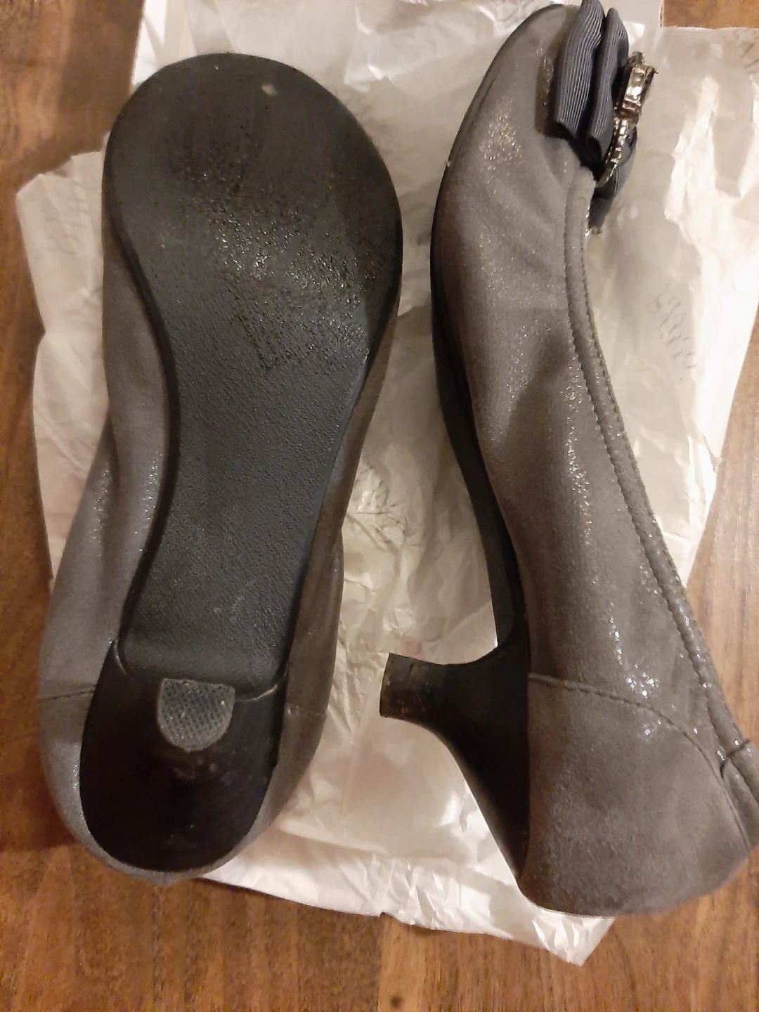 Cute pair of grey ballet flats with a decorative bow and embellishments. They're in good condition and ready for a new home!