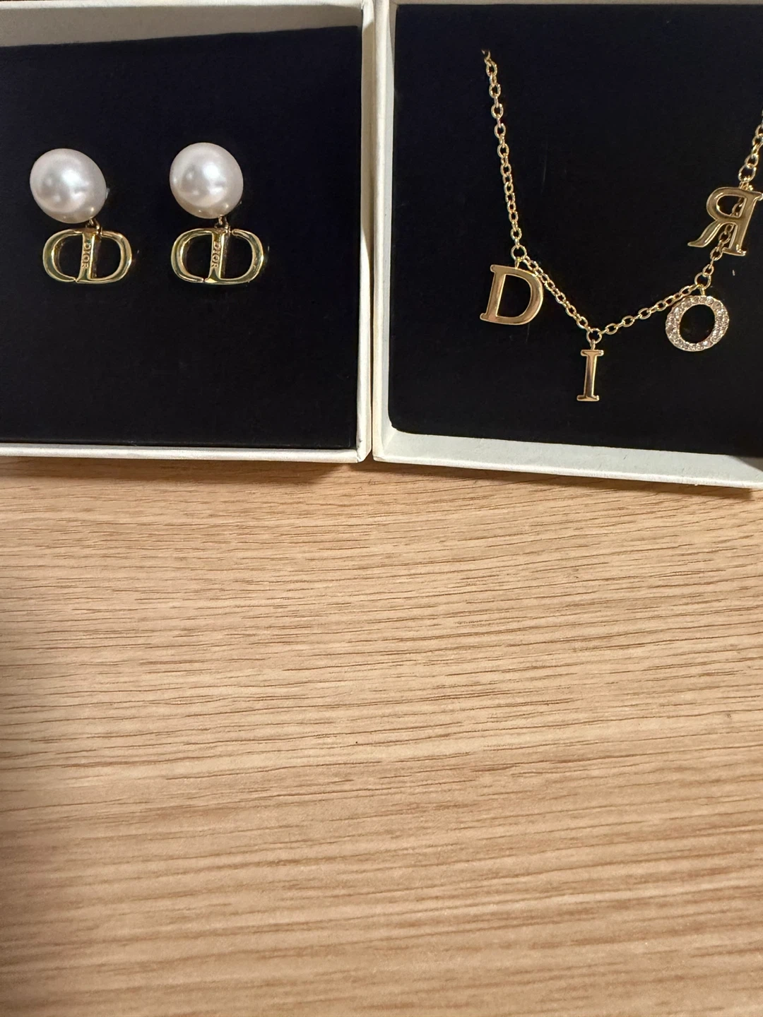 Selling a beautiful Dior earrings and necklace set! The earrings feature the classic Dior logo with pearl accents. The necklace spells out 'DIOR' with a sparkling charm. Both come in their original boxes and are in great condition
