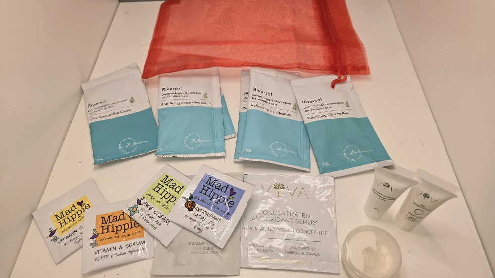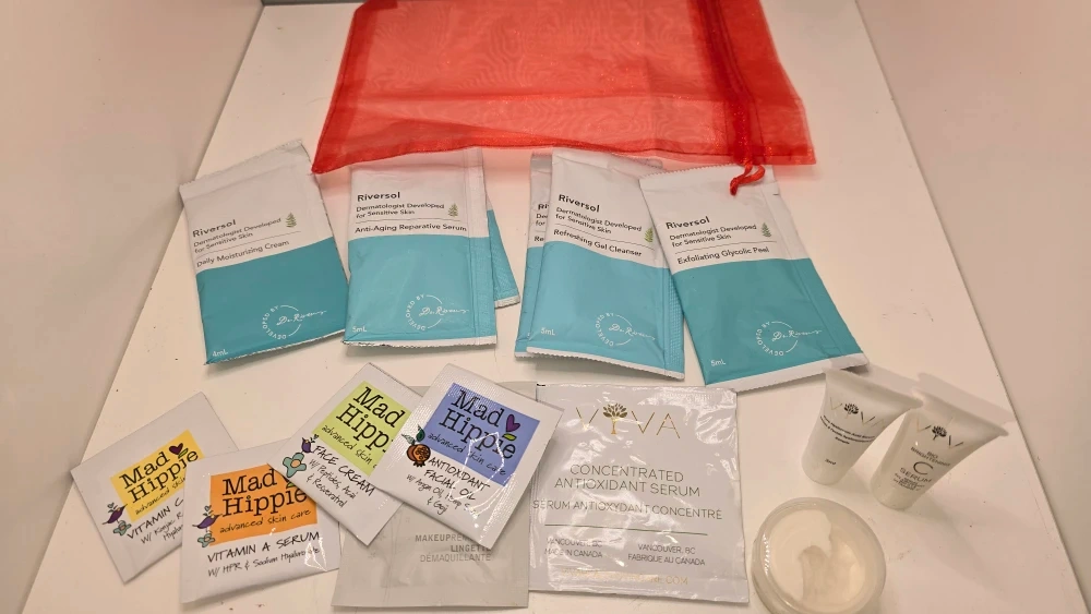 Gift bag variety of skincare samples! You'll find items like moisturizing cream, reparative serum, gel cleanser, and glycolic peel samples. There's also Mad Hippie face cream and antioxidant facial oil, plus Viva concentrated antioxidant serum. For someone who would love a facial or some self-love and cannot afford it