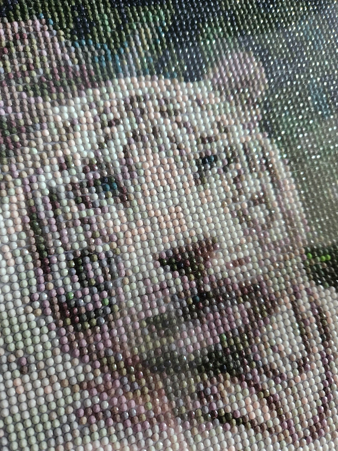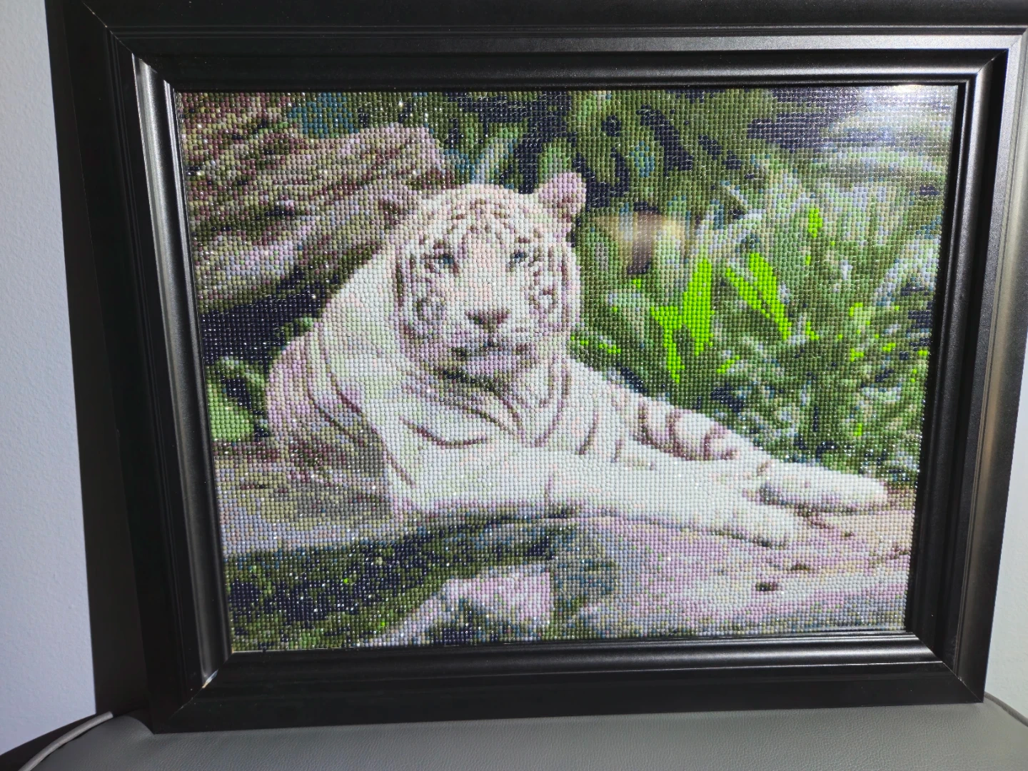 Here's a diamond art painting of a white tiger in a black frame. It's a unique piece of art that would look great in any room!