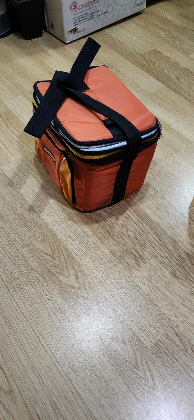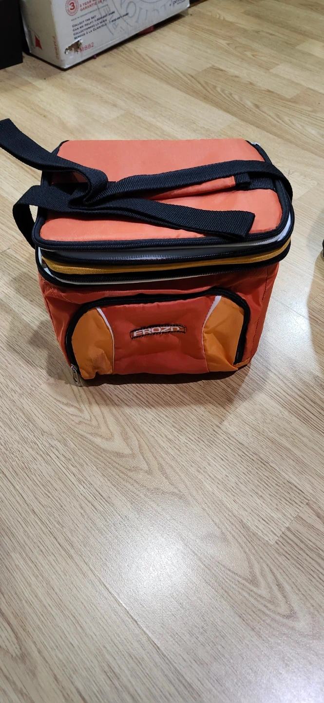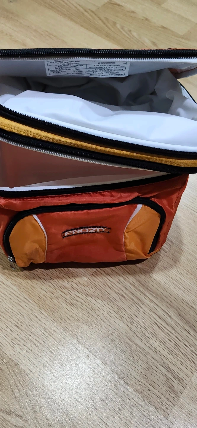 Keep your drinks and snacks cool with this Froz ice bag cooler! It's in great shape and ready for your next picnic or outdoor adventure. The cooler is orange and black, and features a convenient carrying strap. Price firm only cash only pickup no delivery 801 O'Connor drive outside TD Canada Trust bank door East York