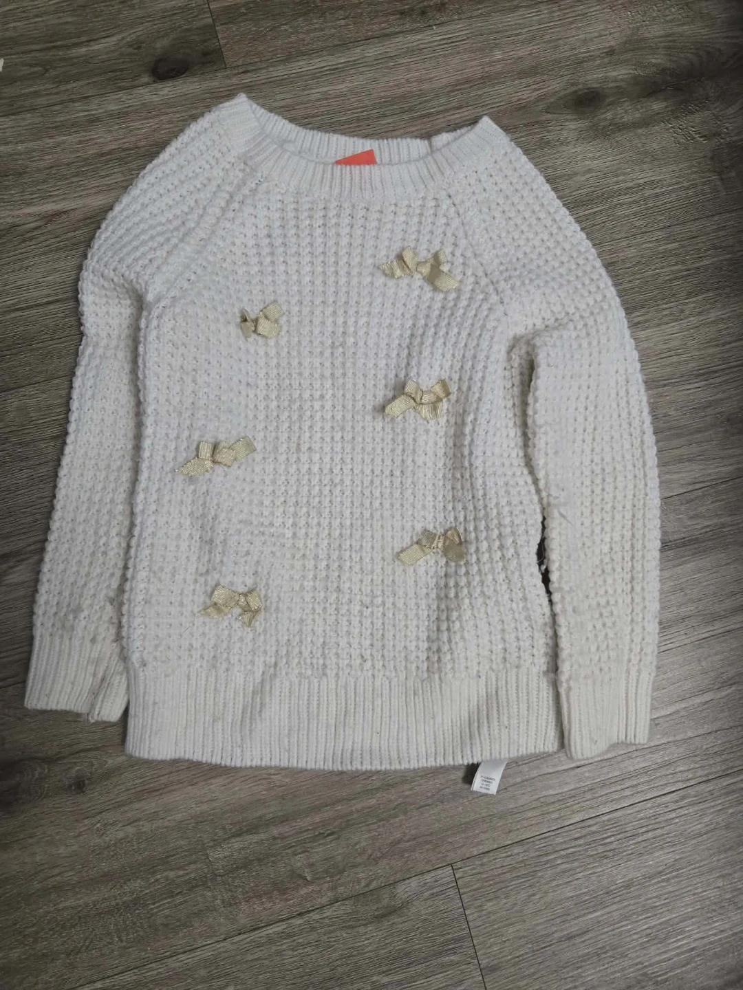 A cute white knit sweater with little bows! It has a nice, cozy texture and would be perfect for layering on cooler days