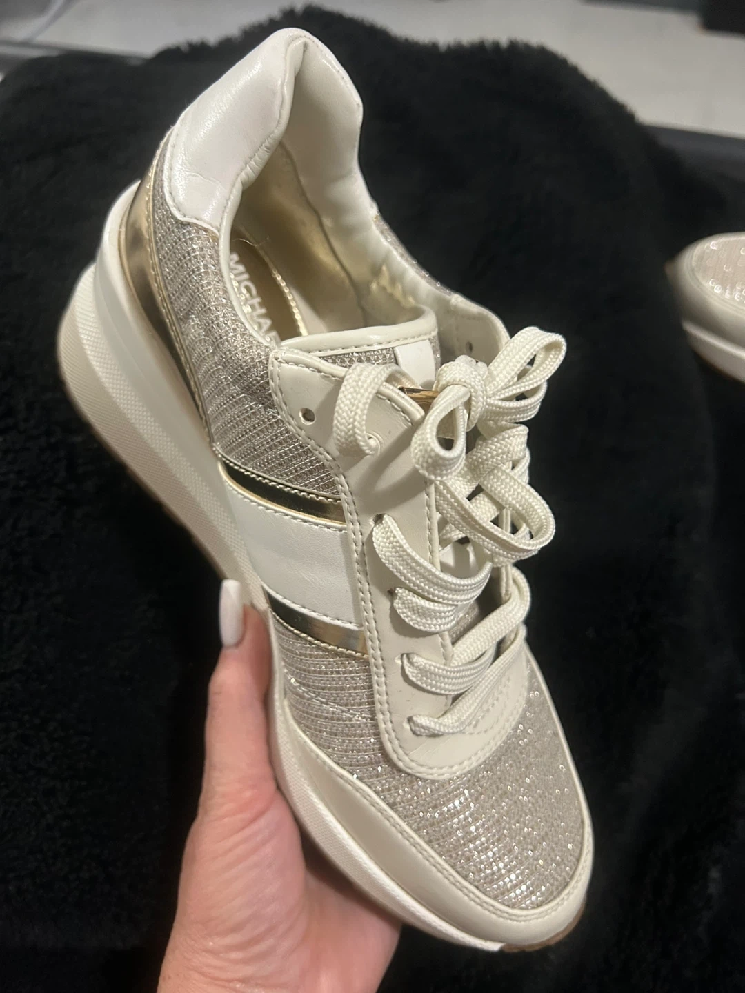Selling these stylish Michael Kors wedge sneakers! They feature a beautiful white and gold design, perfect for adding a bit of sparkle to your outfit. The wedge heel offers a comfortable lift, making them great for everyday wear. These sneakers are in great condition and ready for a new home!
