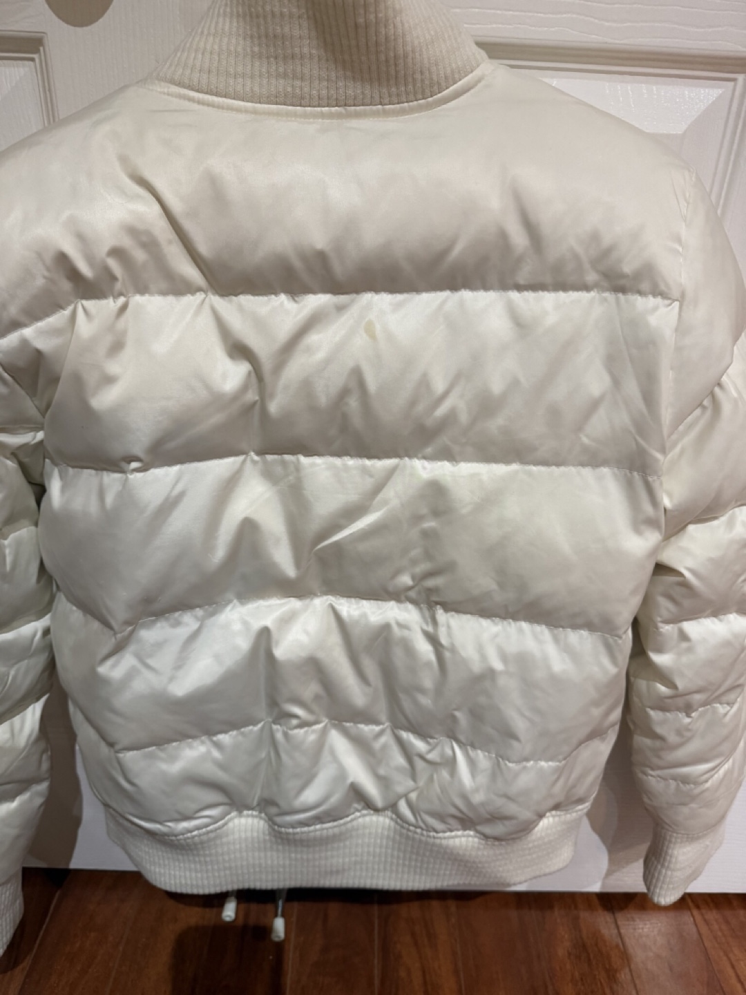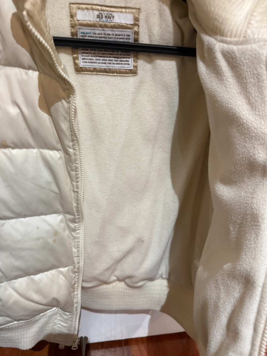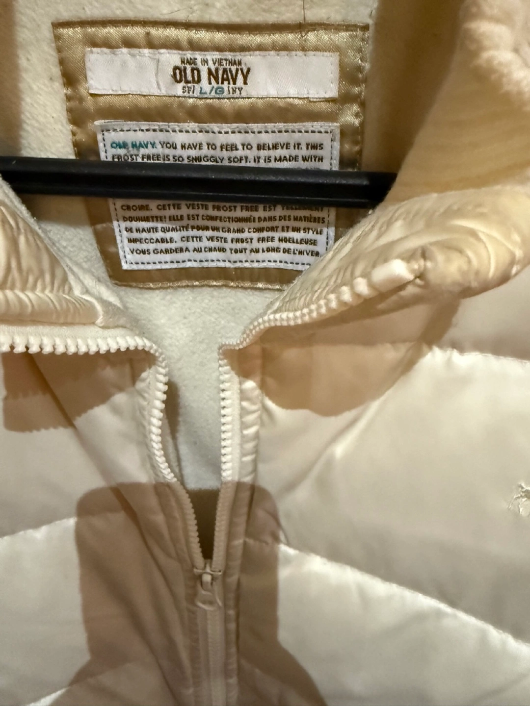Selling a gently used Old Navy puffer jacket in size large. It's a cozy and stylish jacket, perfect for keeping warm. There are some small spots on the front, but otherwise in good condition!