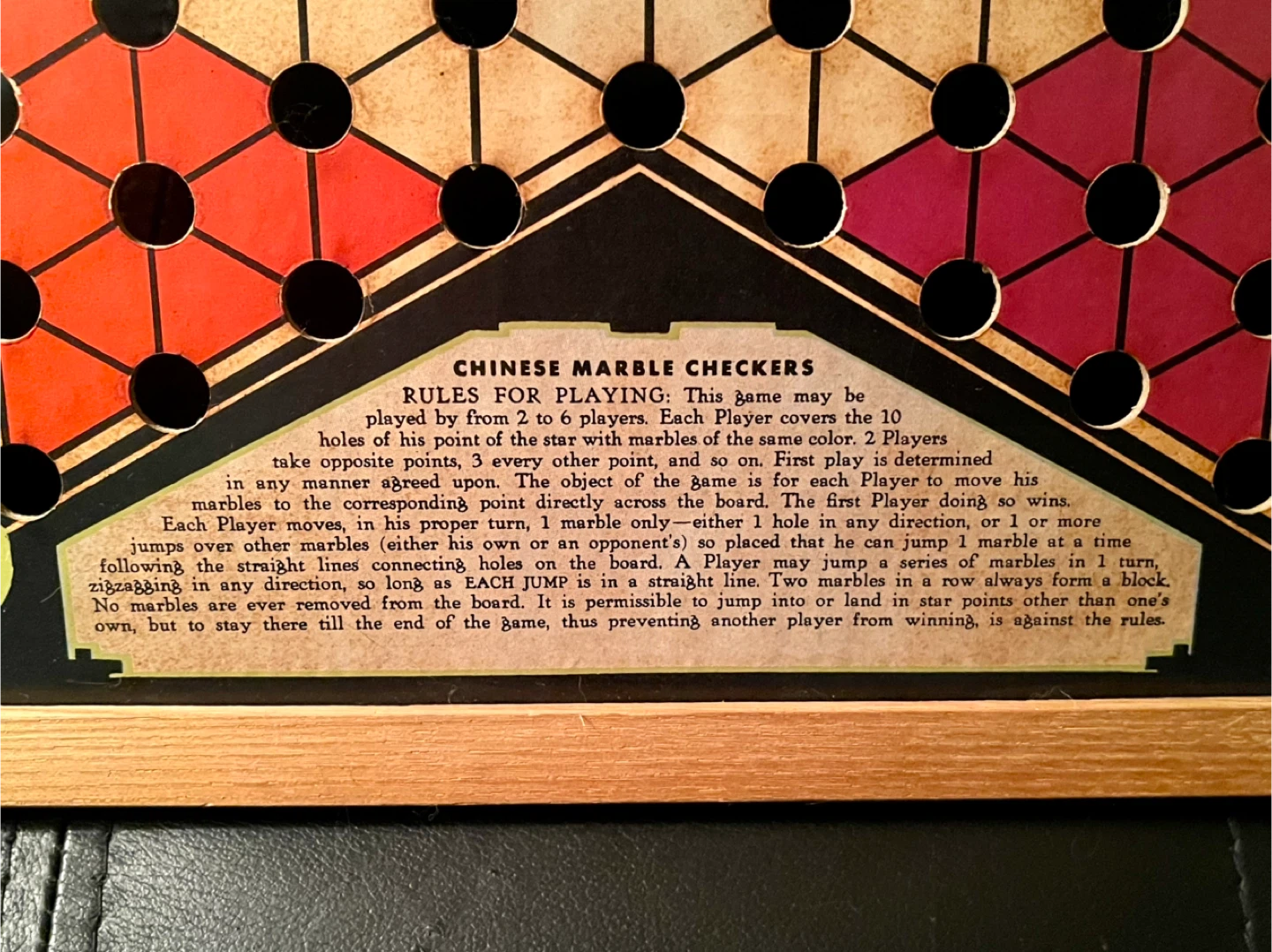 Selling a vintage 1939 Whitman Chinese Checkers board in very good vintage condition. Made in USA. Marbles not included. Beautiful, colourful wall decor or still useable as a game if you provide marbles.