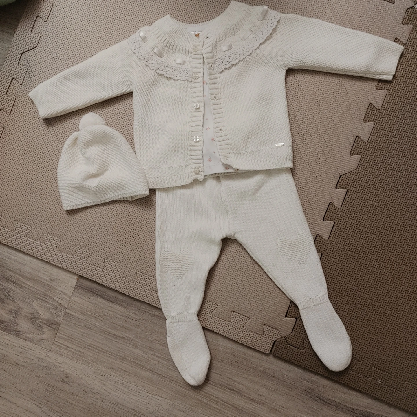 A super cute and cozy 4-piece knit outfit includes a cardigan, pants with footies, a long sleeve shirt, and a matching hat. Perfect for keeping your little one warm and stylish!