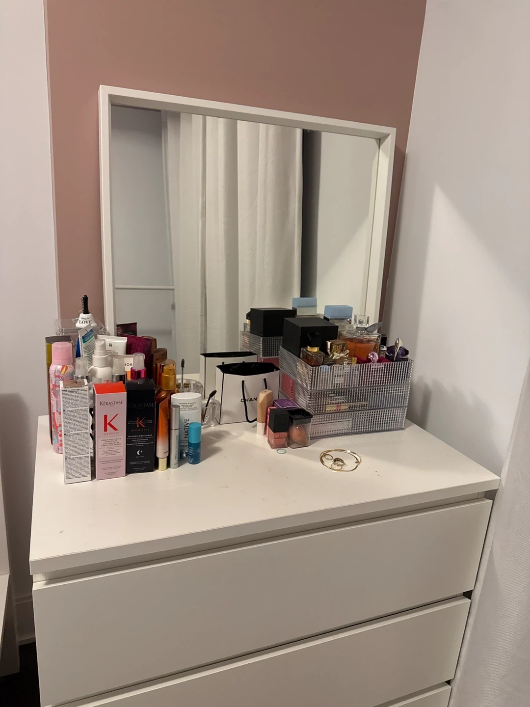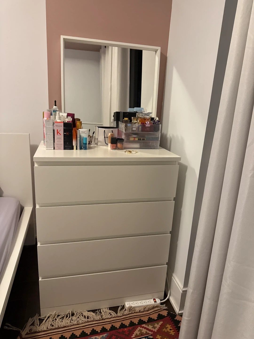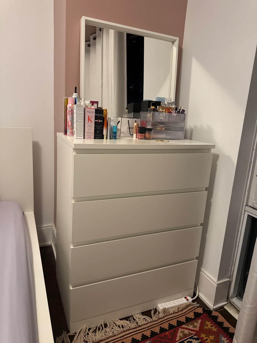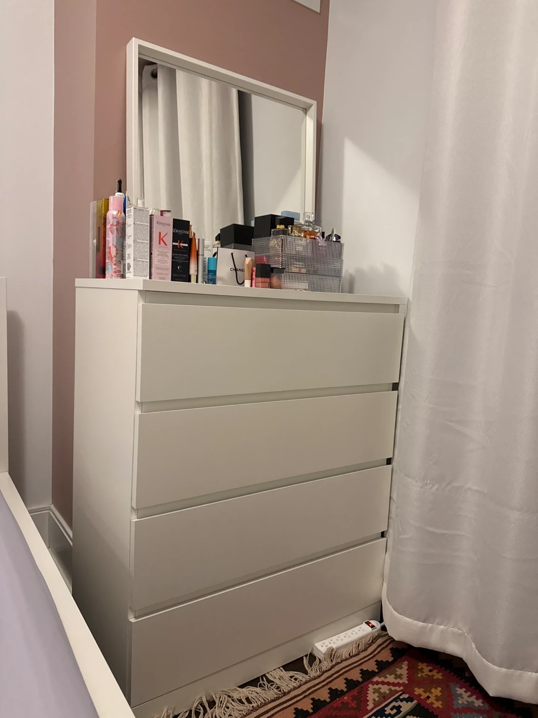 Selling my IKEA Malm dresser with four drawers and a matching mirror. It's in great condition and perfect for adding storage to any bedroom or living space. The dresser is white, and the mirror sits nicely on top. It's a simple and functional piece! The price is for both.
