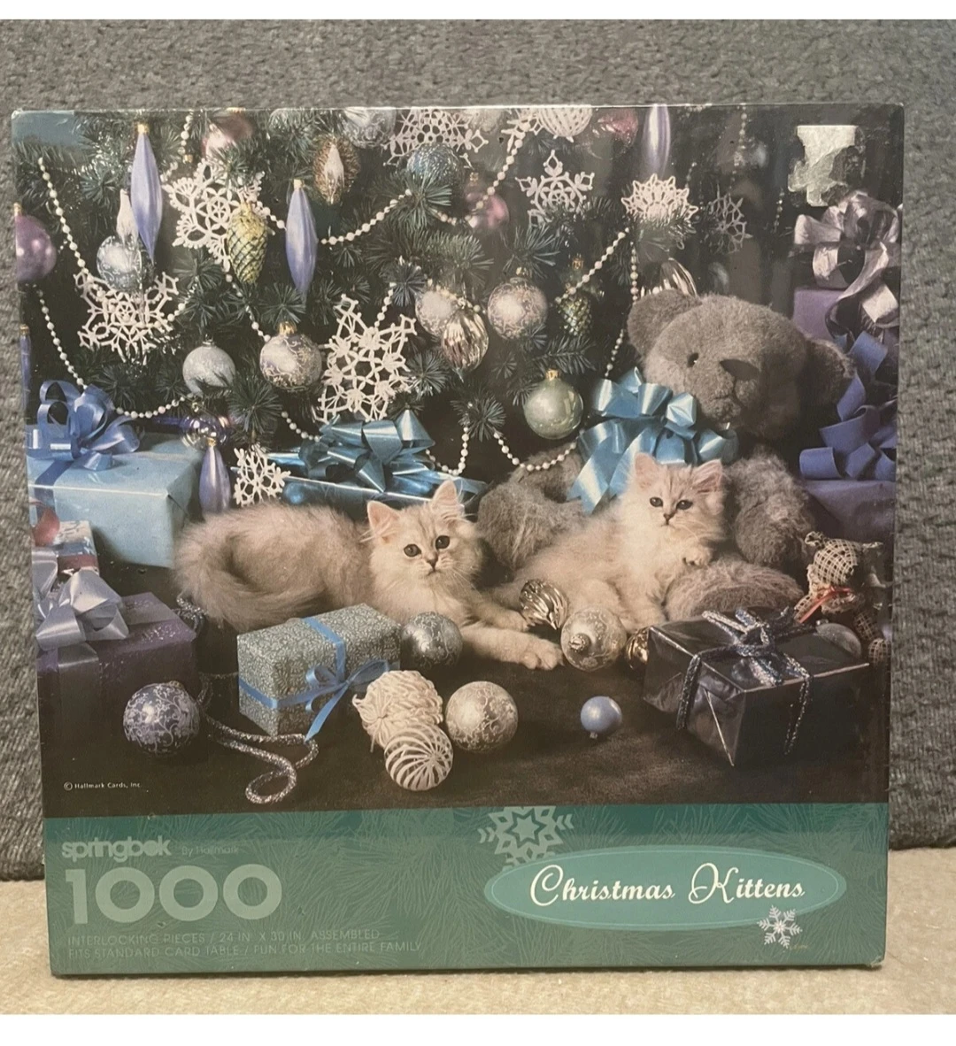 Selling a Springbok 'Christmas Kittens' 1000-piece jigsaw puzzle! It features an adorable festive scene. It's interlocking and measures 24 x 30 inches when assembled, perfect for family fun around a standard table