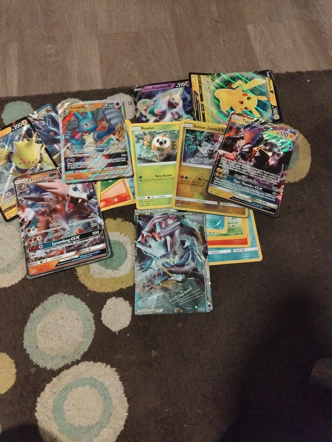 Selling a collection of Pokémon cards, including Lucario VSTAR, Galarian Rapidash V, Rowlet, Reshiram, Zekrom & Ky, Lycanroc GX, Tapu Koko, and others! Great for collectors or players looking to expand their deck
