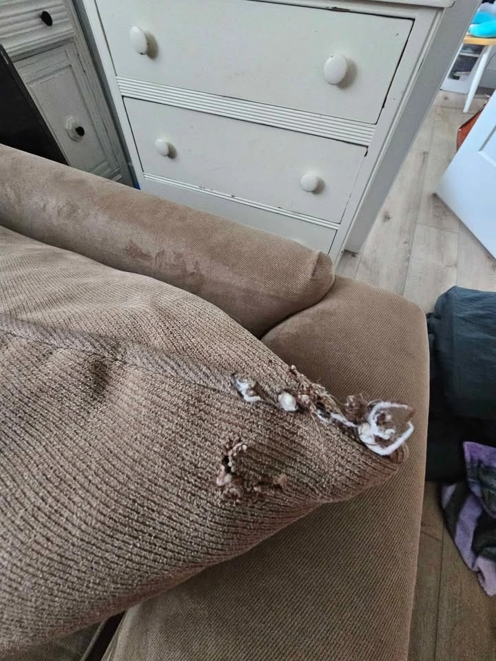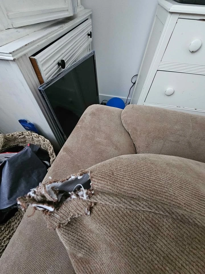 Custom chair and a half bought from GP furniture. Was well loved for many years. New puppy used corners as chewies. Seam on cushin can easily be sewn as covers can be removed and thrown in the washing machine. Don't have room for it in our new place.
