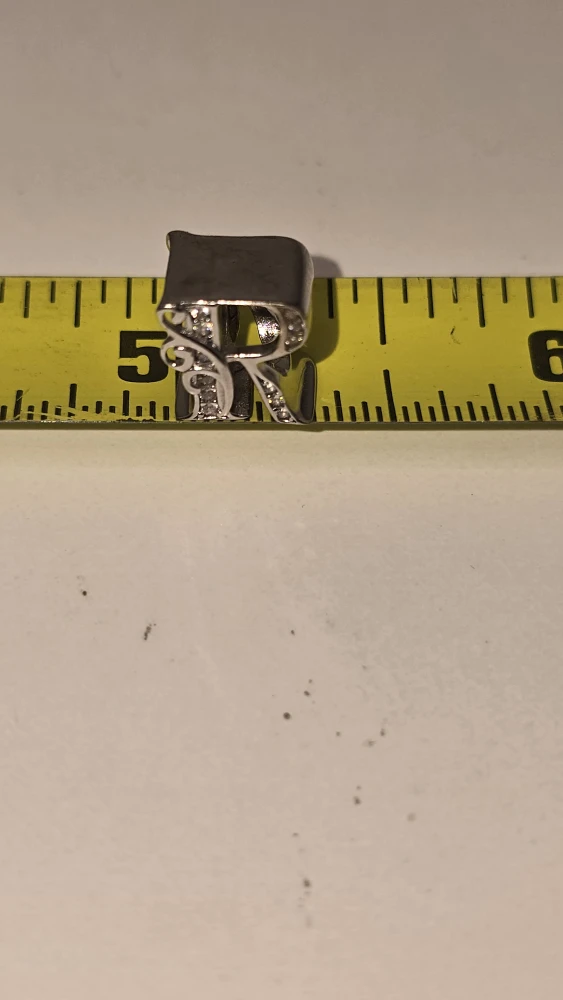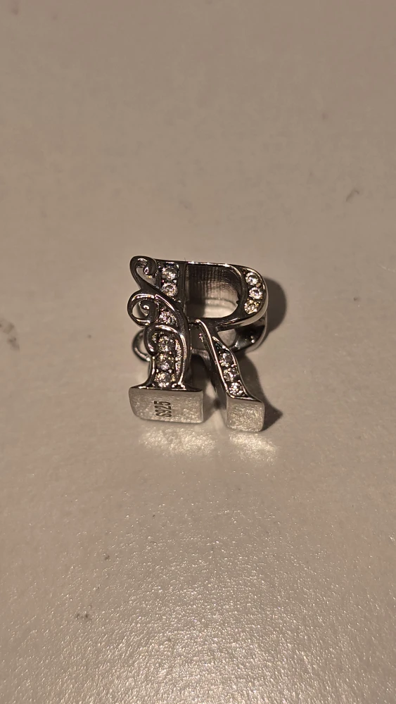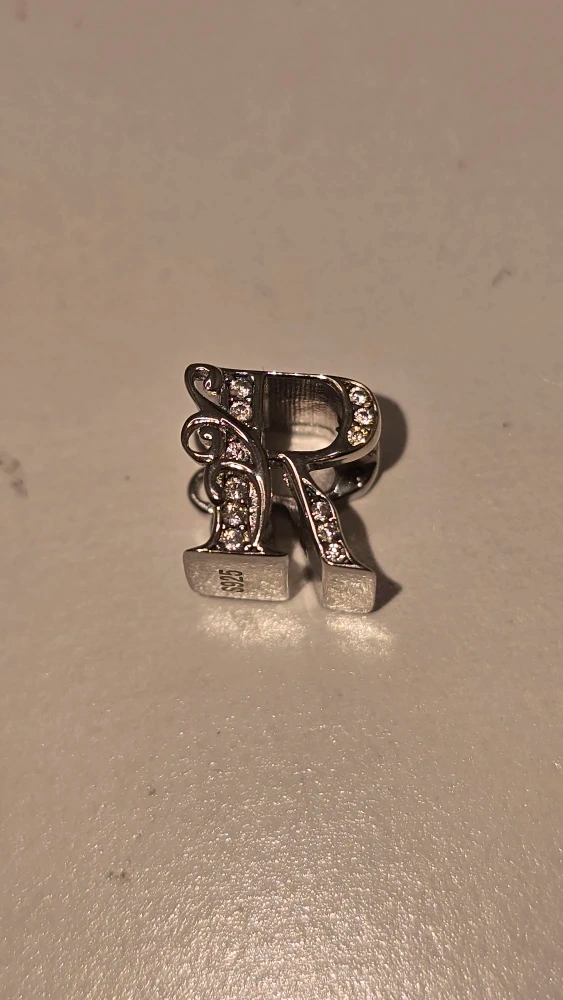925 silver letter R charm pendant. It's a silver-toned charm with rhinestones