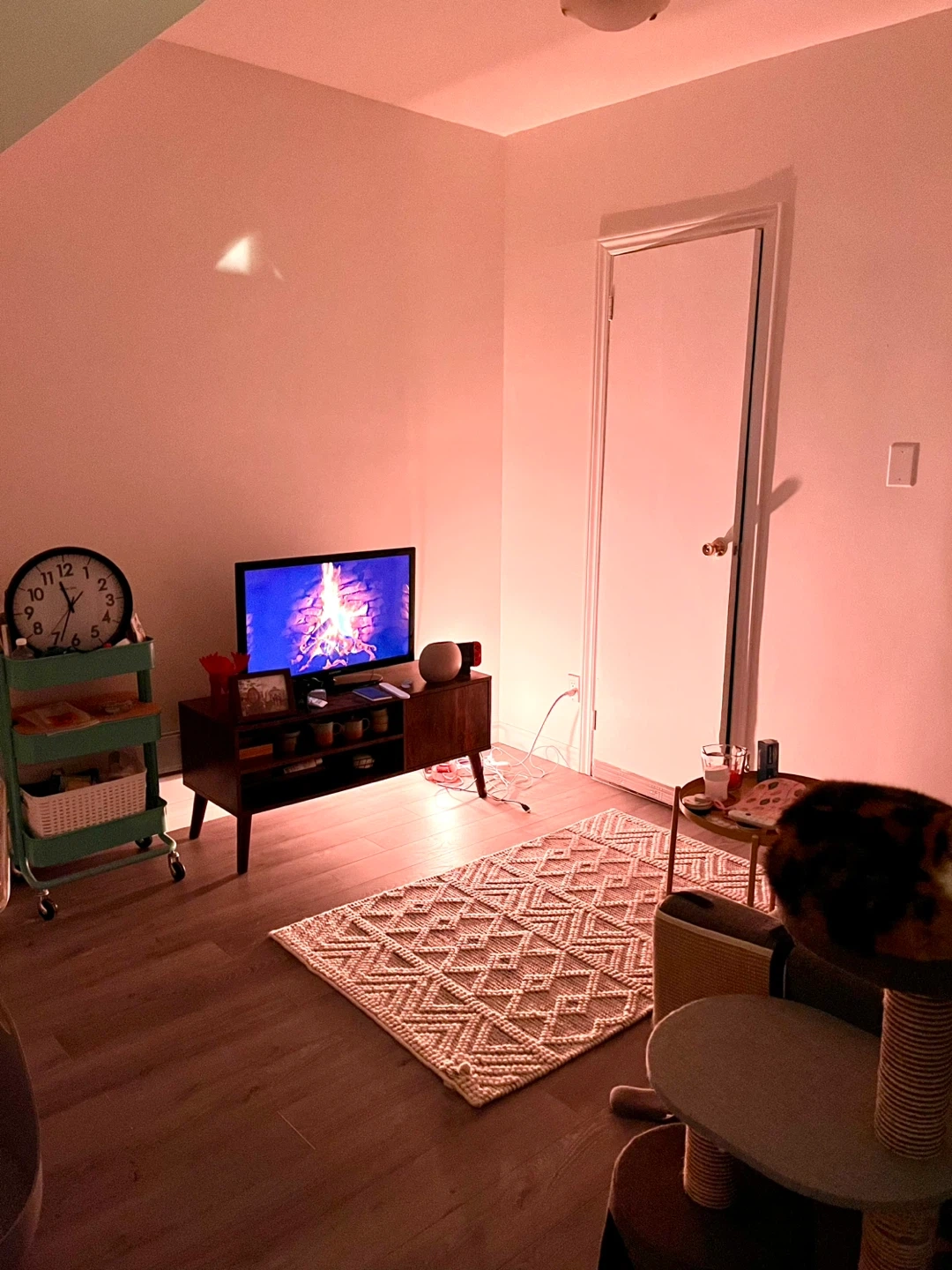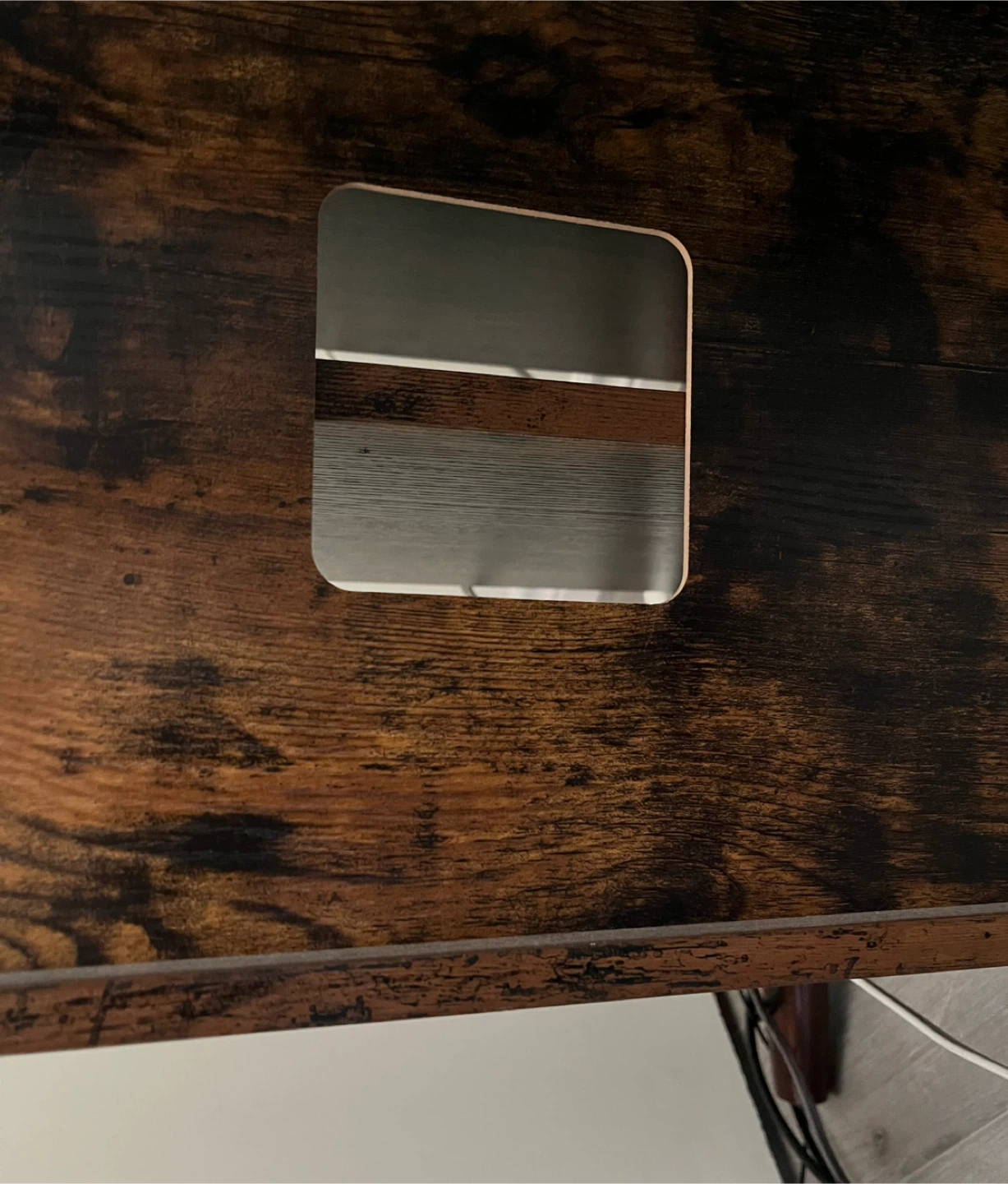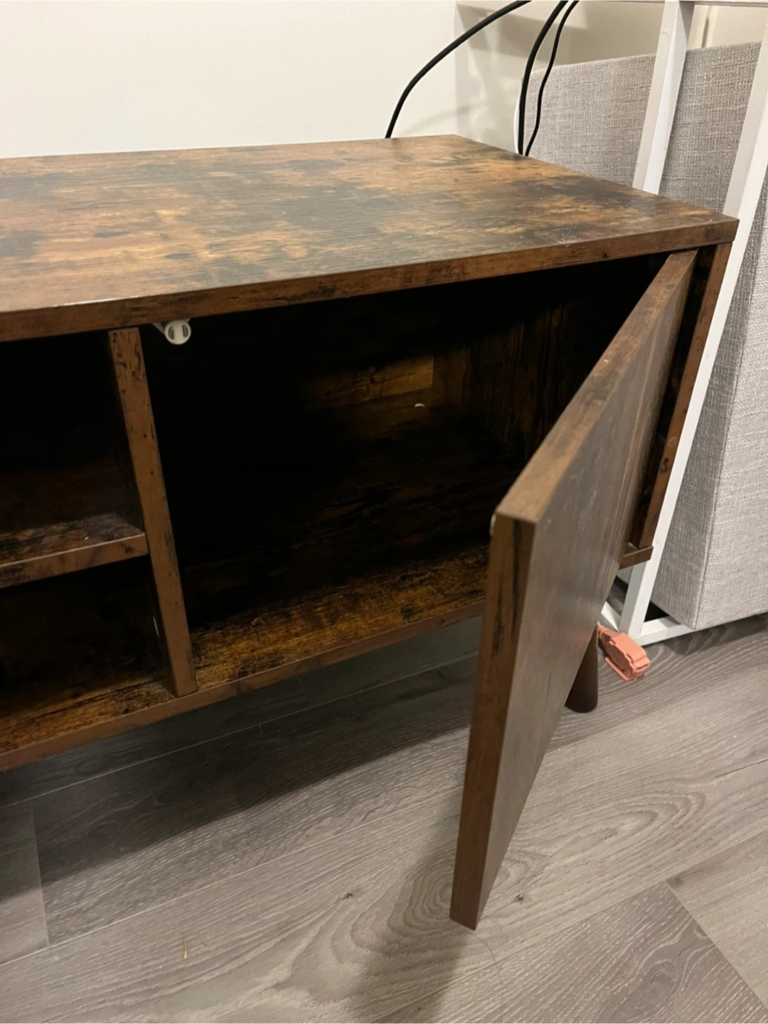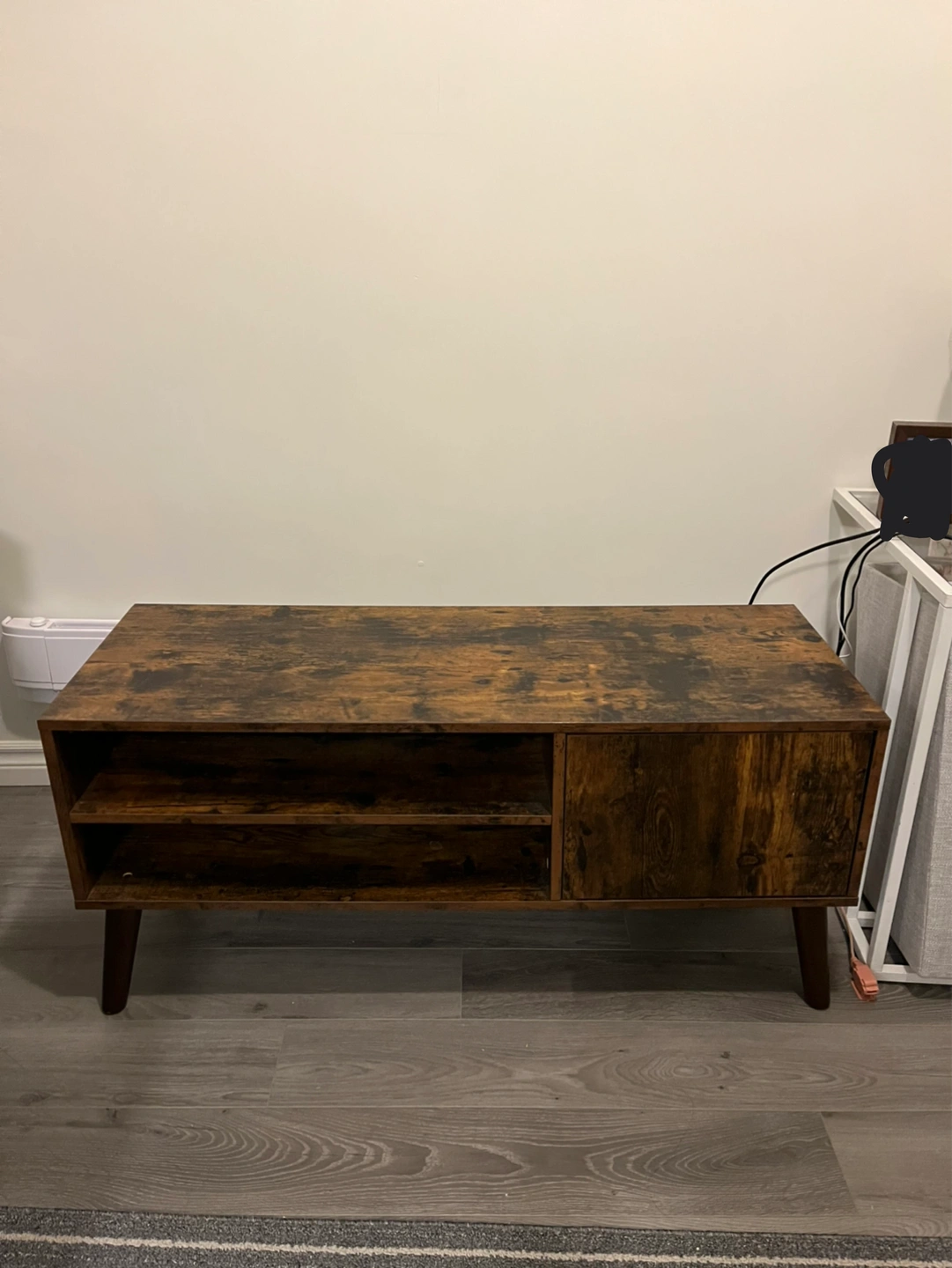 It features an open shelf and a cabinet with a door, perfect for storing media devices or other items. There is an opening at the back of the cabinet, so you can easily run cables through it. The table is in great condition and ready for a new home!
