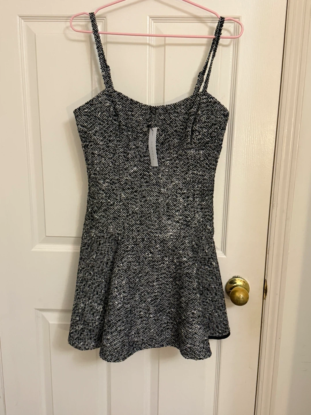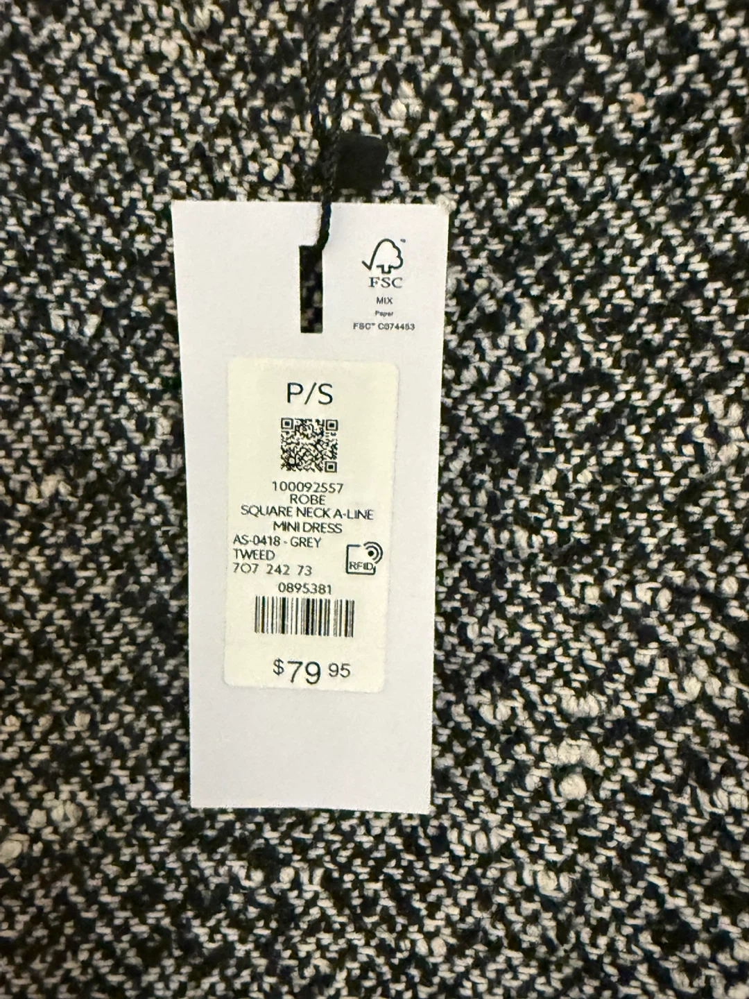 Selling a Dynamite Square Neck A-Line Mini Dress in size P/S. It's a stylish tweed dress in grey tones. The tag shows it was originally $79.95!