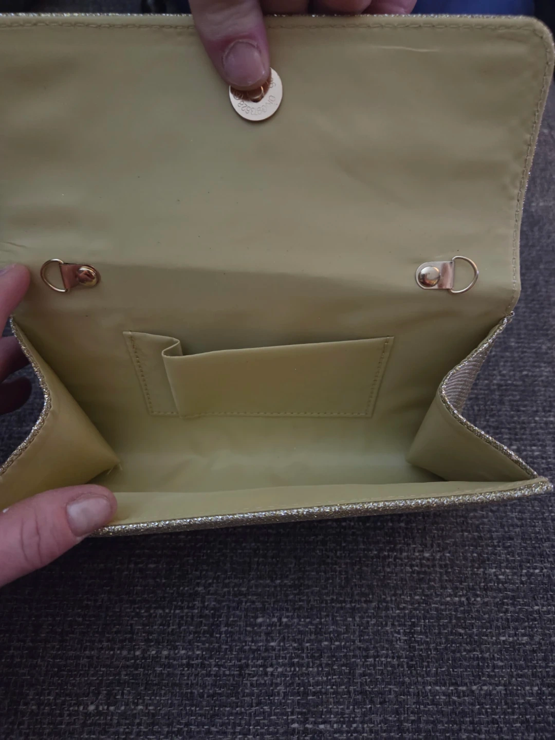 Selling a cute gold clutch! It's in great condition. Perfect for a night out or a special occasion. It has a magnetic closure and a small pocket inside
