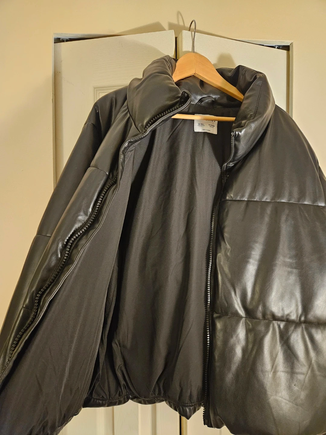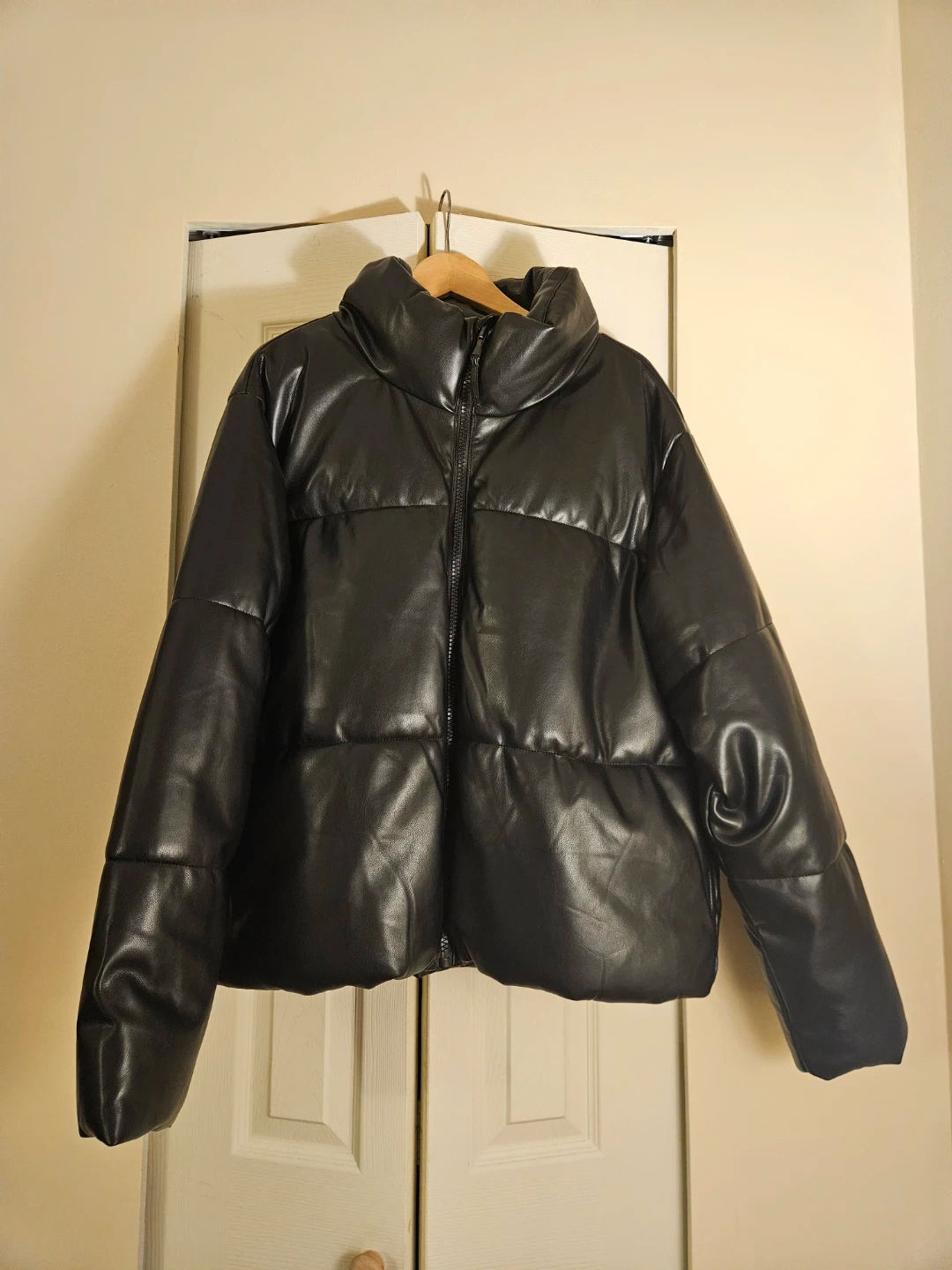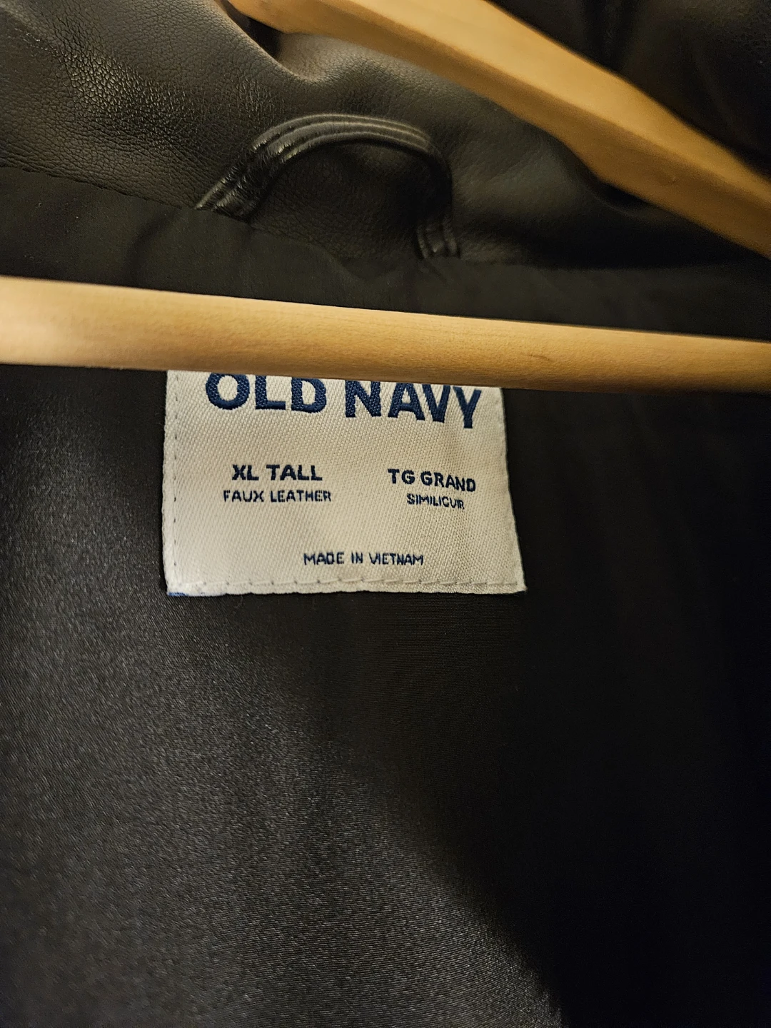 Selling a stylish Old Navy puffer jacket in XL Tall size. It's made of faux leather and is in great condition. Perfect for adding a bit of edge to your winter wardrobe!