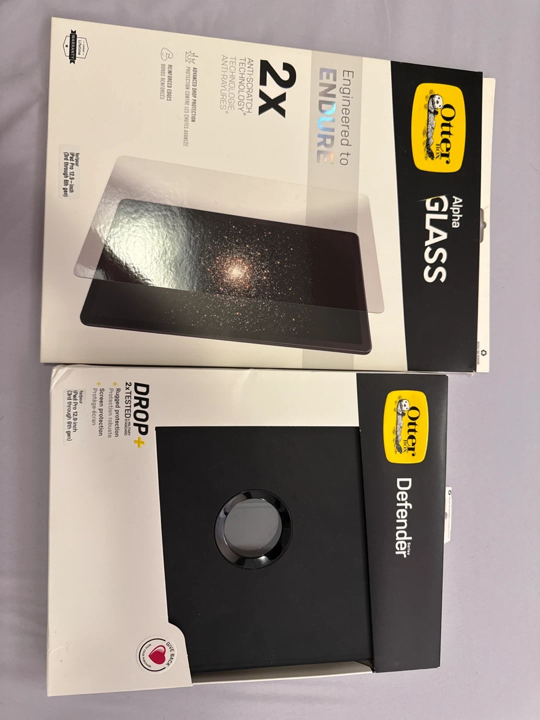 Selling an Otterbox Defender case and Alpha Glass screen protector for the 12.9-inch iPad Pro. The Defender series offers rugged protection, and the Alpha Glass provides advanced scratch technology. Both are new and ready to keep your iPad safe and sound! The price is for both.