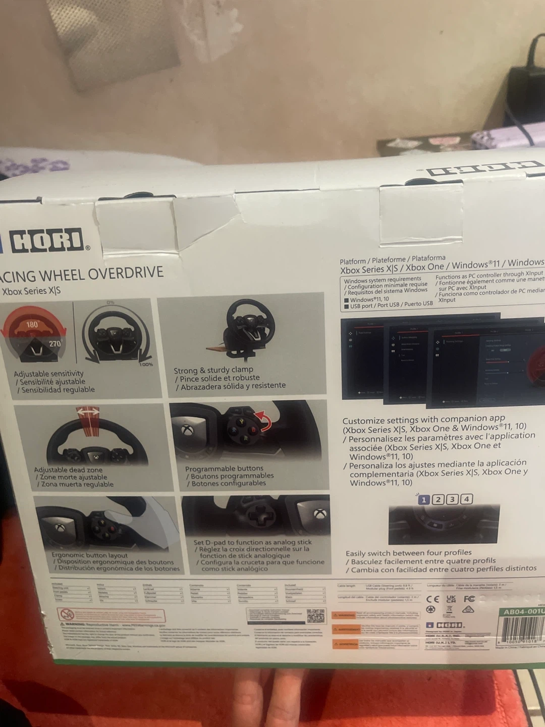 Selling a HORI Racing Wheel Overdrive for Xbox Series X|S. It features adjustable sensitivity, strong and sturdy clamp, programmable buttons, and an ergonomic button layout. The box includes a large & stable foot pedal unit. Customize settings with the companion app for Xbox Series X|S, Xbox One & Windows 11/10, and easily switch between four profiles