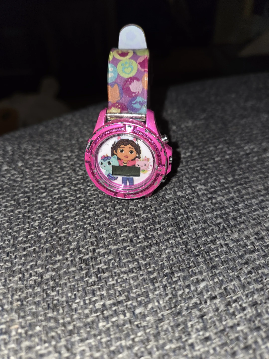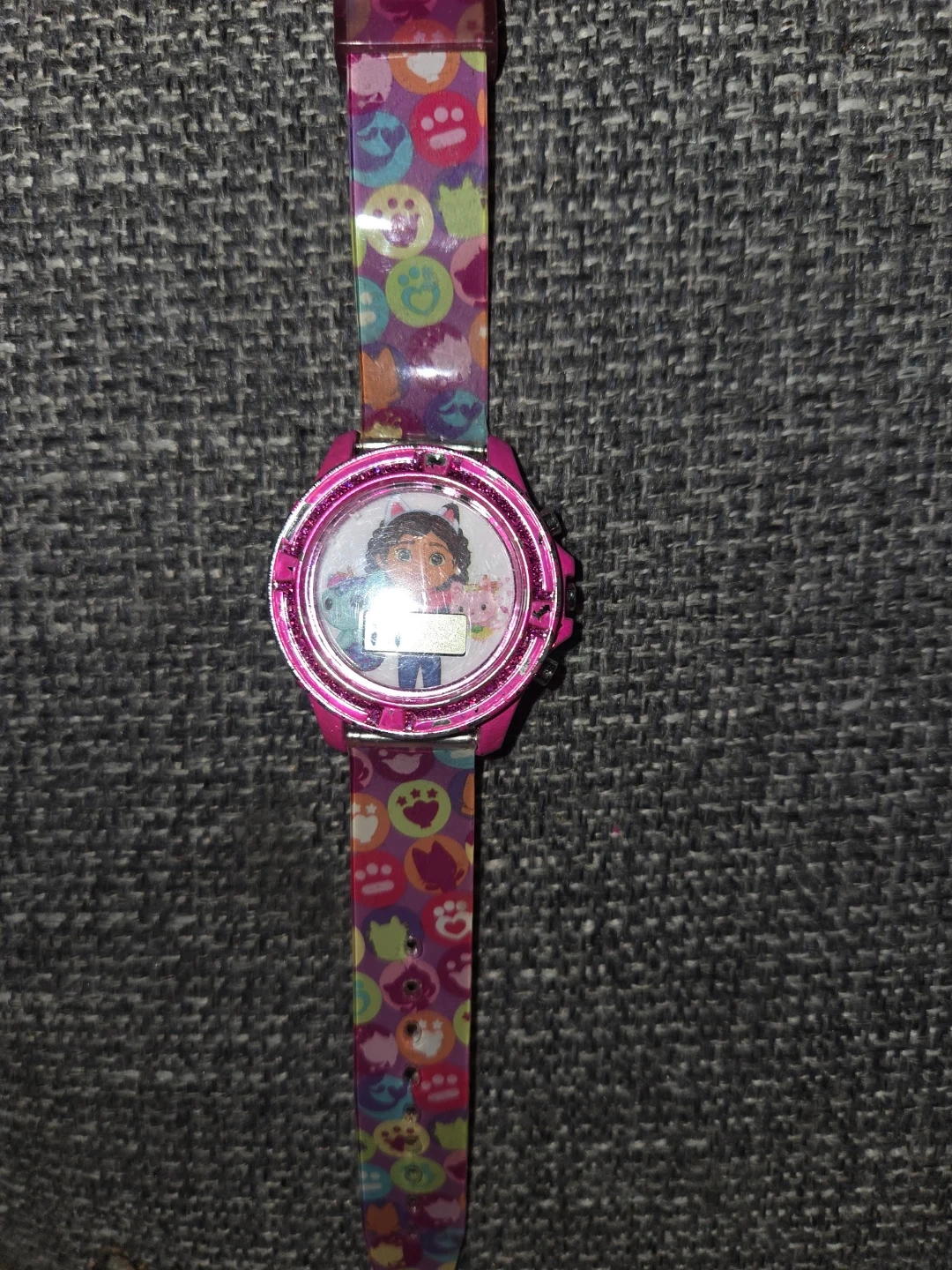 This is a cute Gabby's Dollhouse watch for kids! The watch features a pink case and a colourful band with Gabby's Dollhouse themed designs. It requires 2 x LR41 (1.5V) batteries.