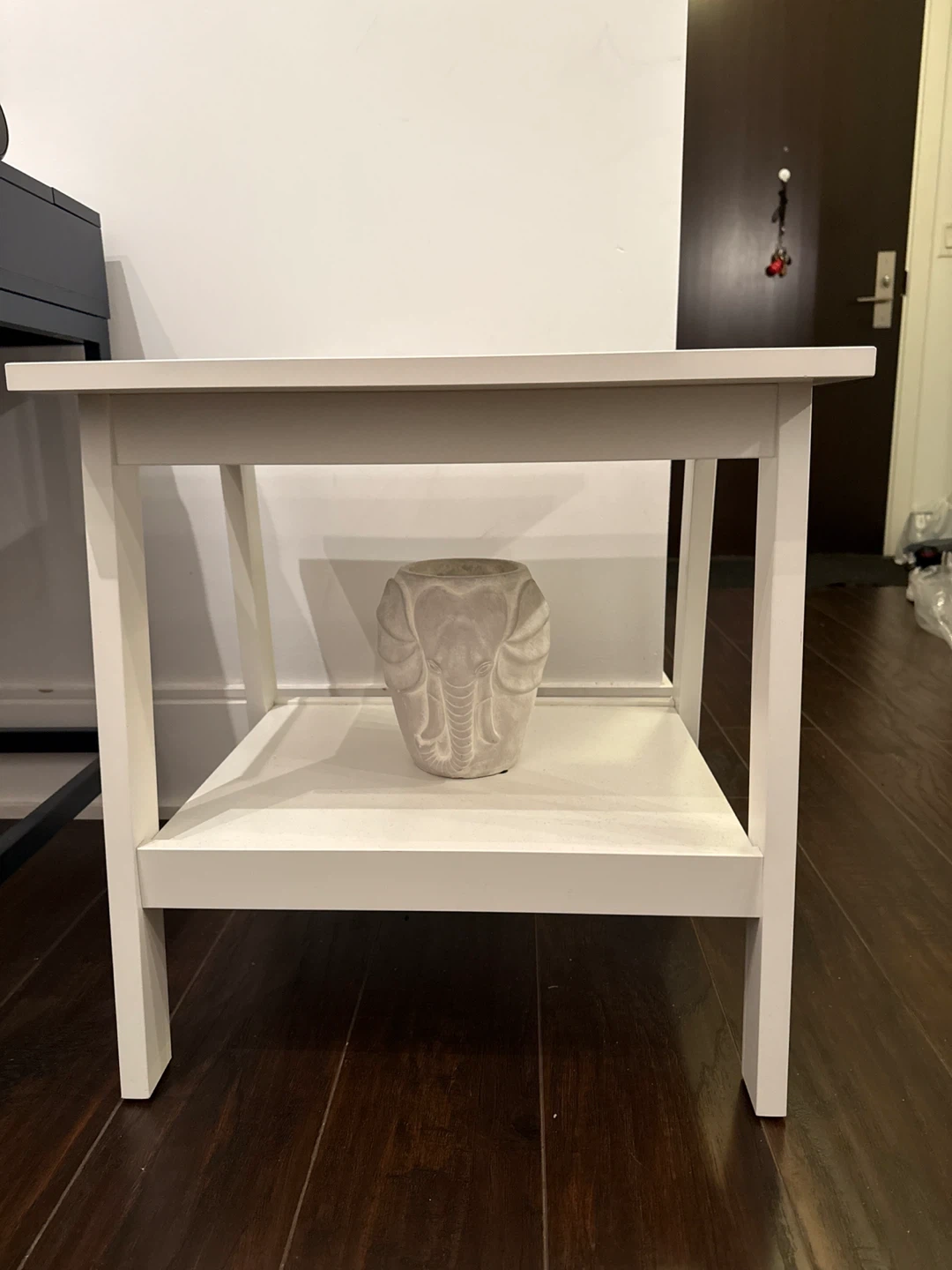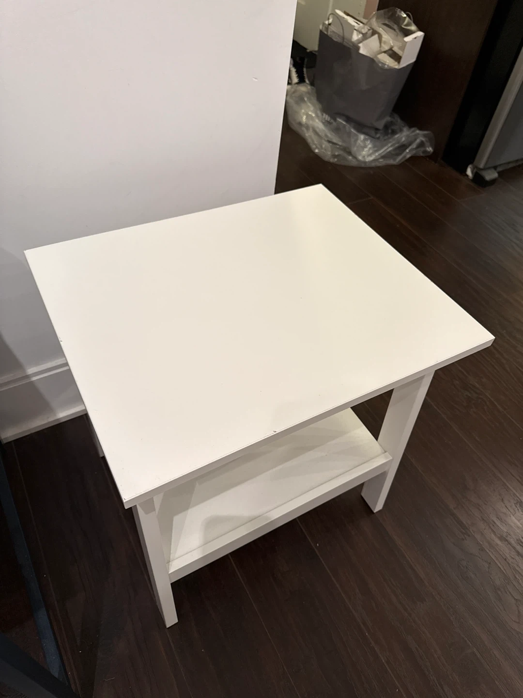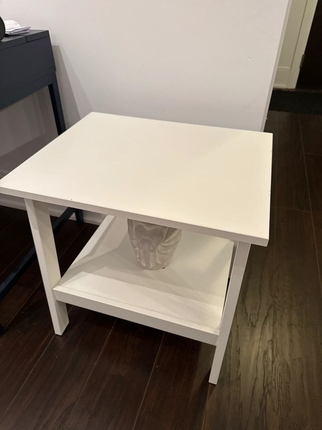 Selling a simple white side table! It has a convenient shelf underneath for extra storage or decor. It's in great condition and would be a nice addition to any room!