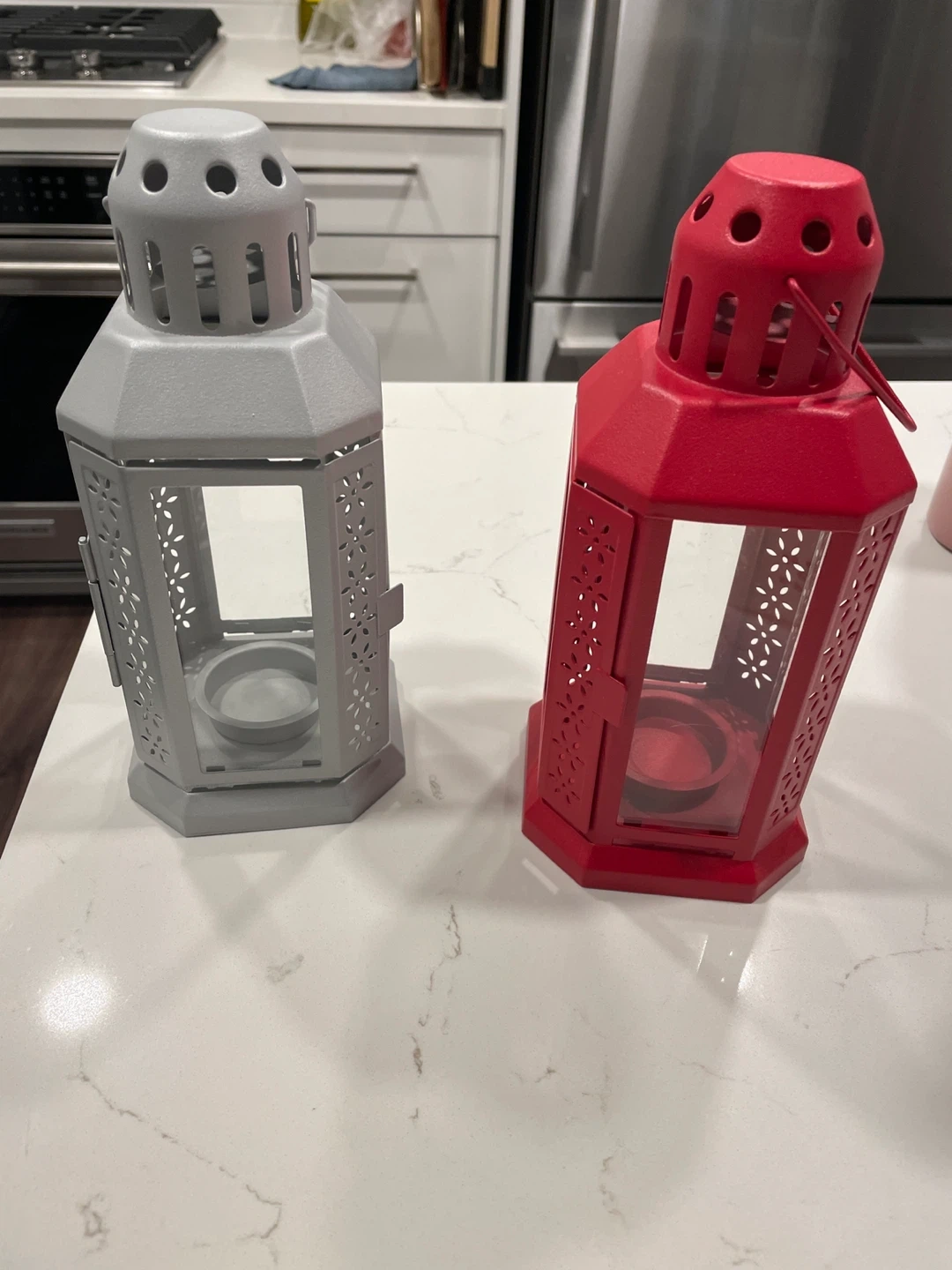 Selling two decorative lanterns! One is a nice neutral grey, and the other is a vibrant red. They're perfect for adding a cozy touch to any room or for outdoor gatherings. They're in great condition and ready to brighten up your space