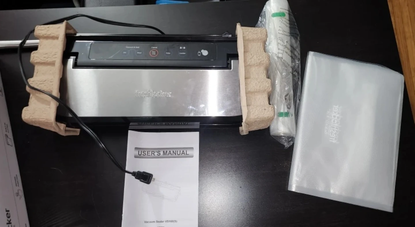 Selling a freshlocker Vacuum Sealer, model VS160S! It comes with the user manual, a roll of bags, and a set of individual bags. The box is included as well. It features a built-in cutter and is sous vide cooking assistant ready!