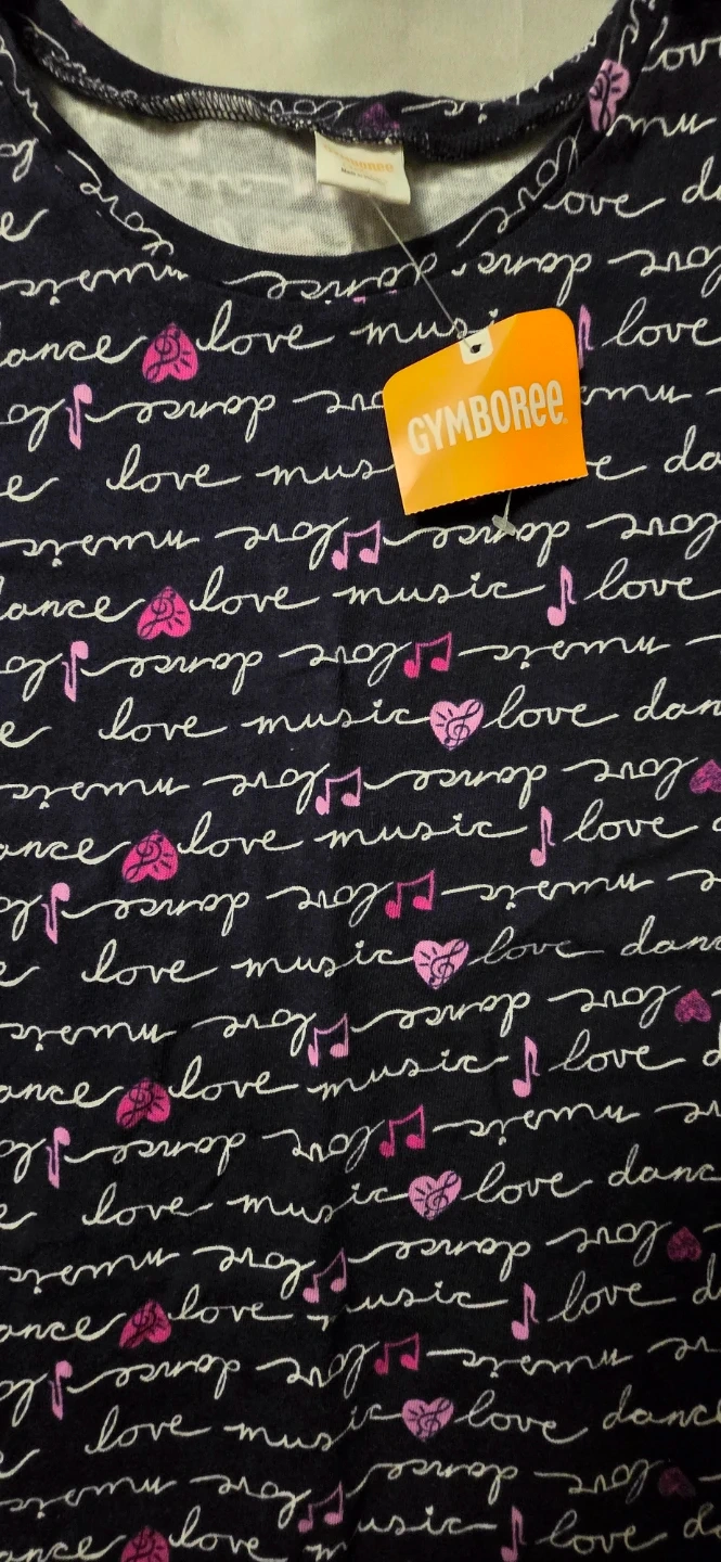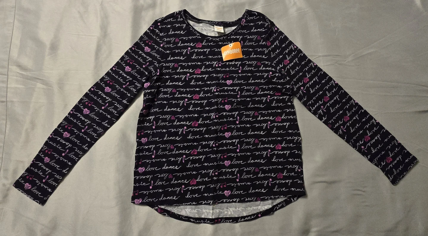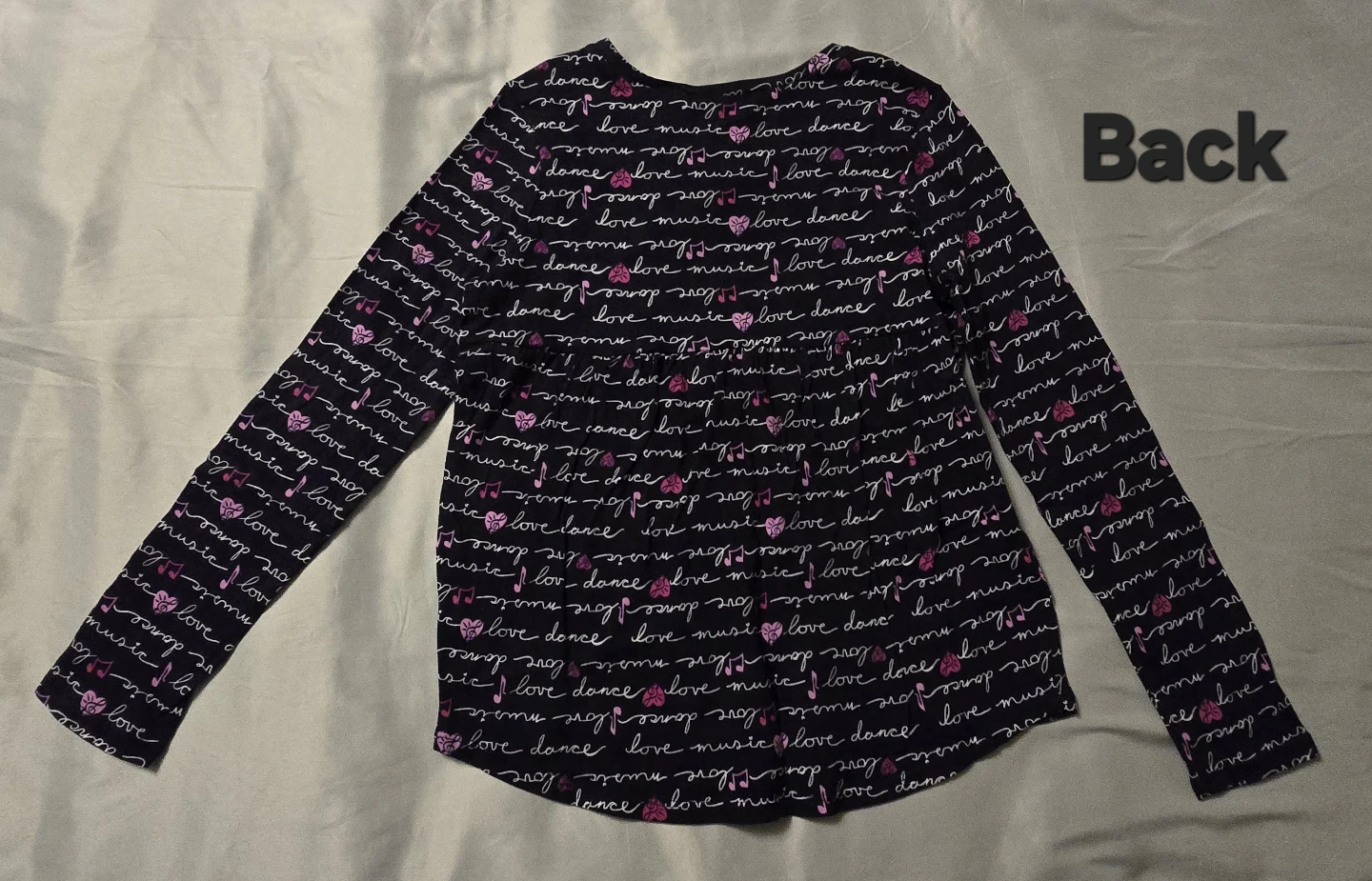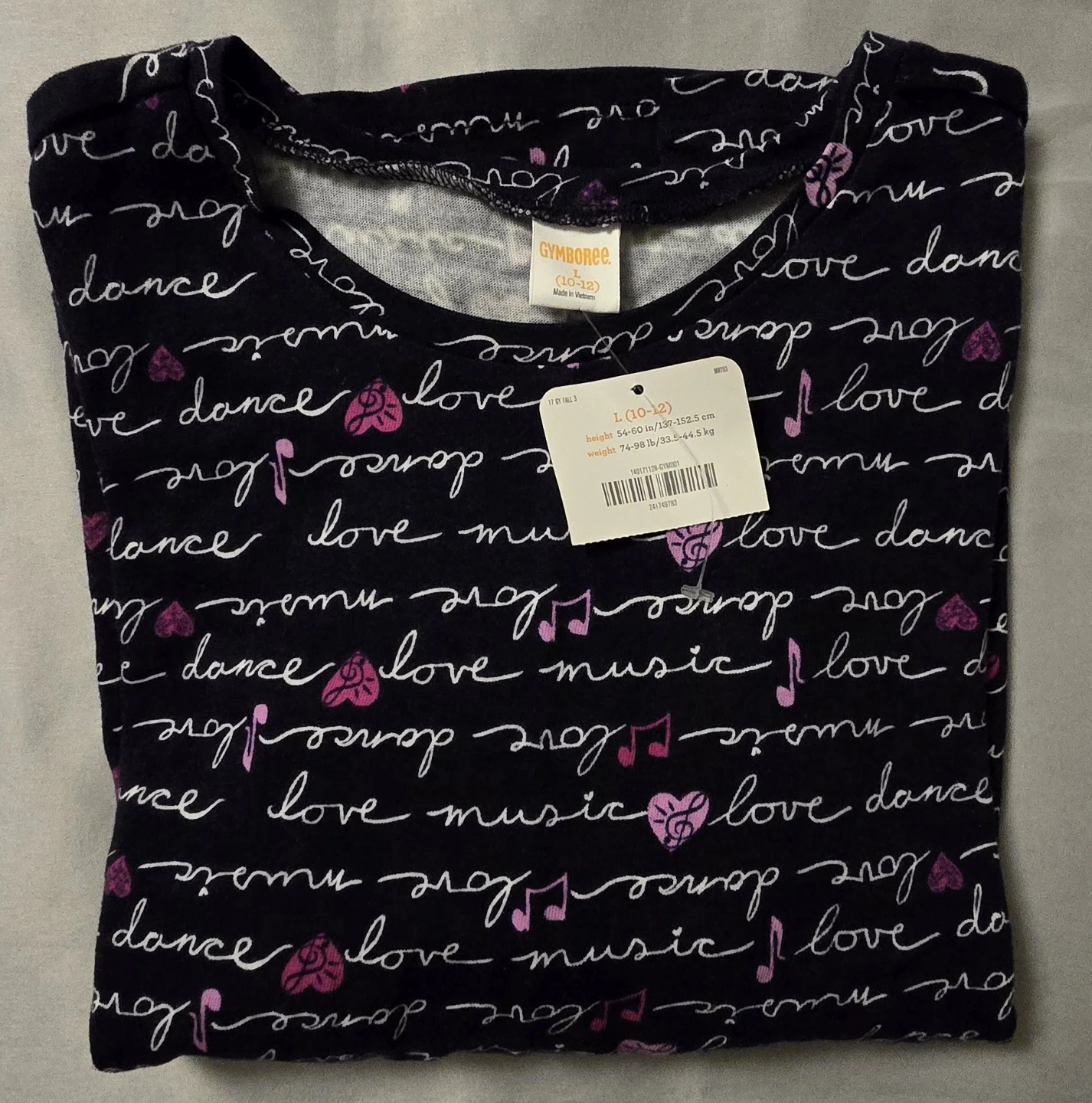 This is a cute, brand new, with tags, Girls Gymboree long-sleeve top! Size 10-12! It has a fun pattern with the words 'love,' 'dance,' and 'music' along with hearts and music notes. Perfect for any young music lover!