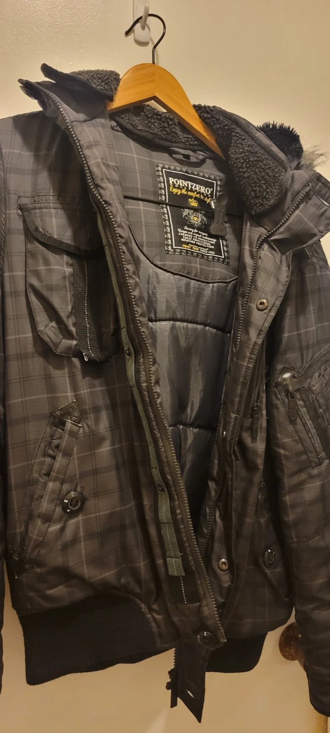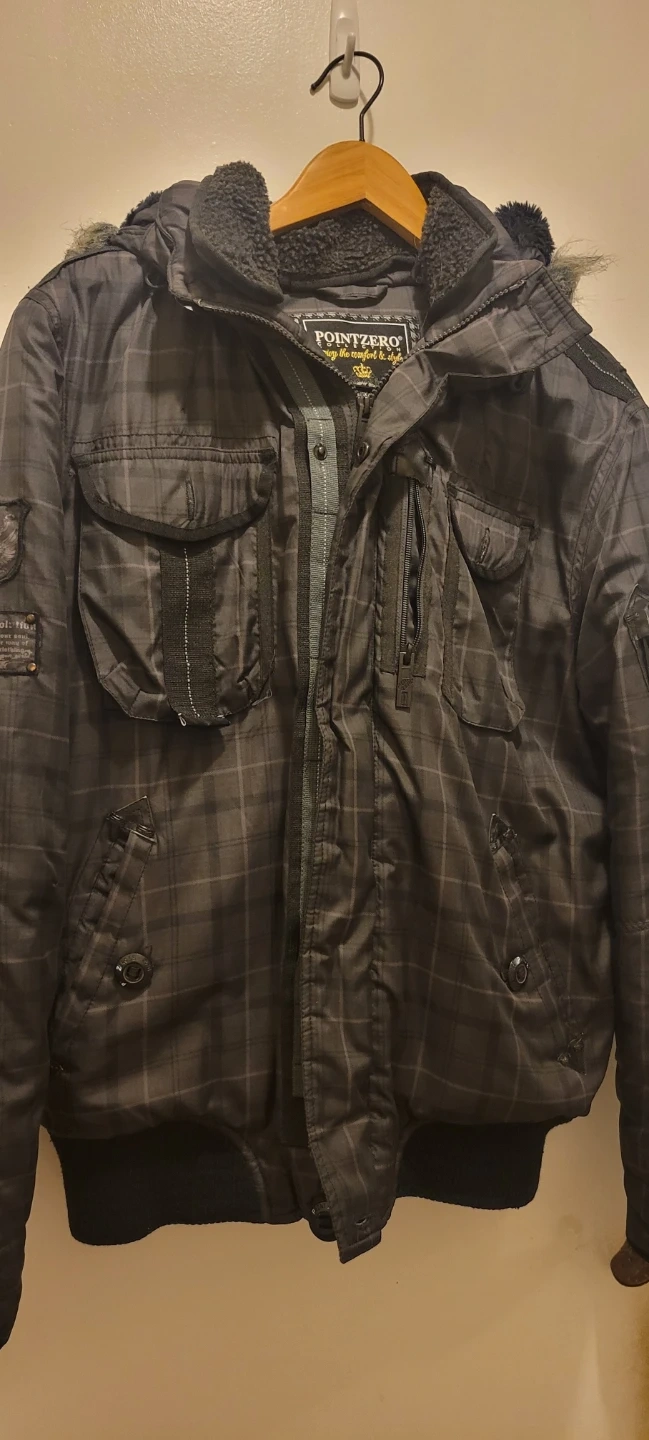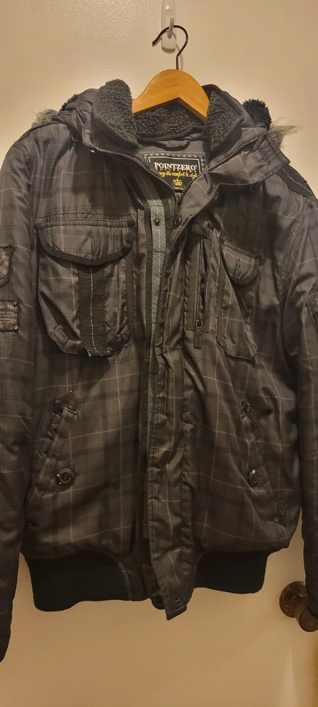 Selling a Point Zero winter jacket with a plaid pattern. It has a hood with fur trim and lots of pockets!pickup near Burcoquitlam skytrain Station or lougheed skytrain Station
