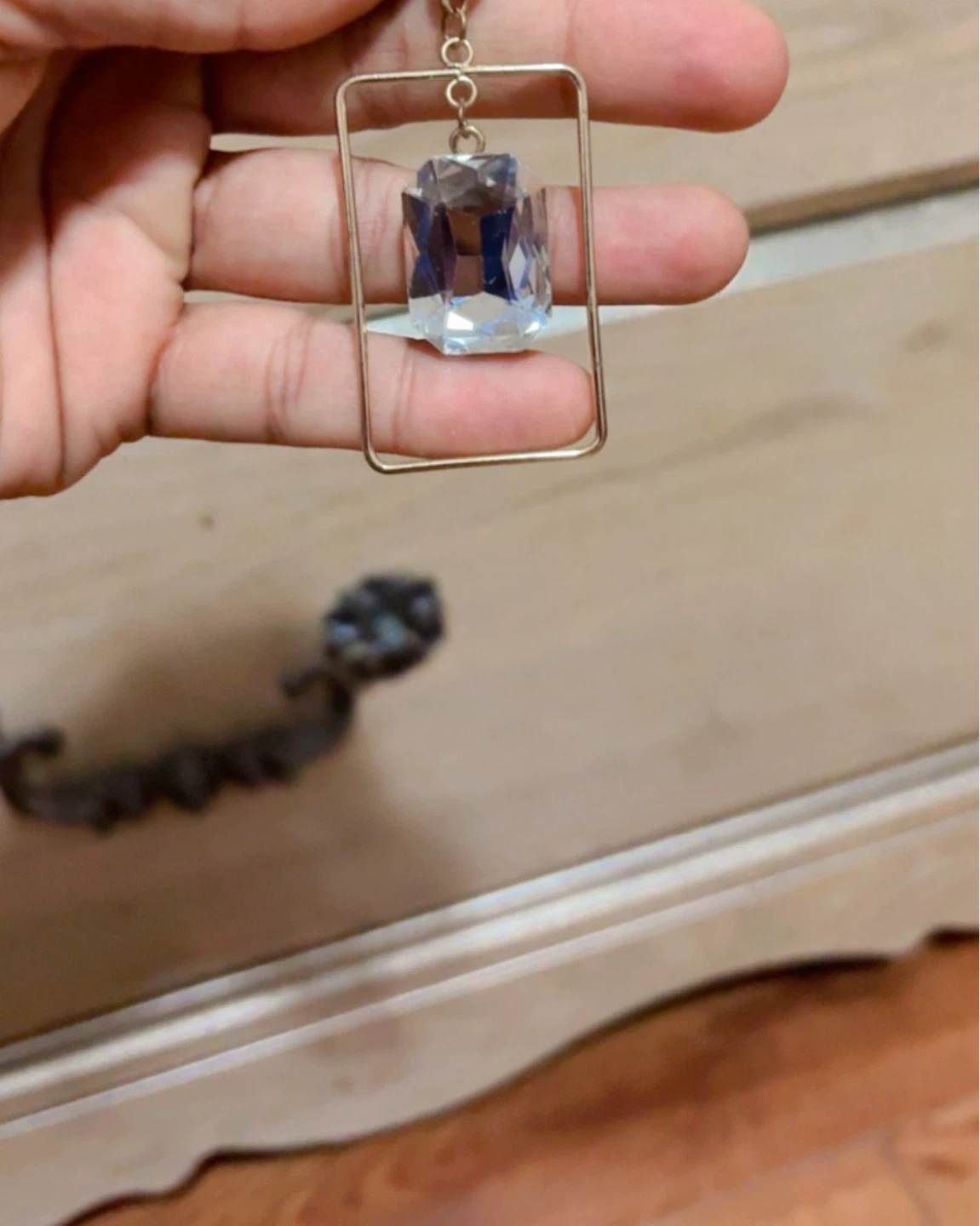Selling a pair of gold-tone earrings with rectangular gemstone pendants. They are in good condition and would be a great addition to any outfit