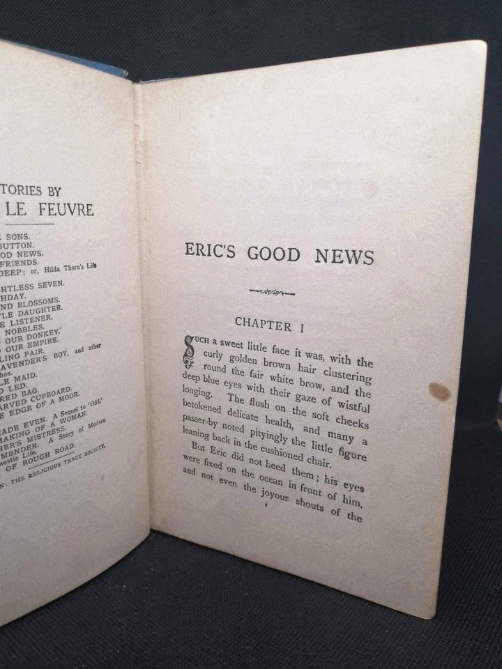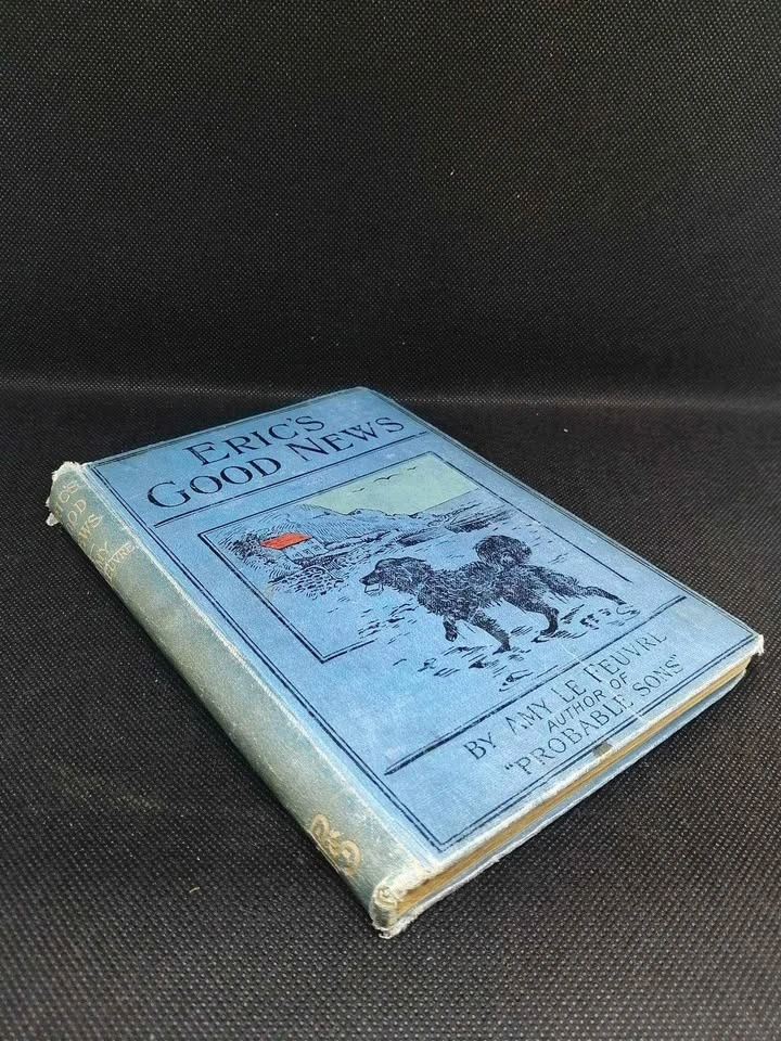 1907 Eric’s Good News Author: Amy Le Feurve Published By: London: The Religious Tract Society Pages: 90 Binding: Hardcover Edition: 7th Condition: Good Non-authorial inscription before the Frontispiece Minor Cocked Spine, Slight Hinge Separation only before Titlepage Slight Wear on the Head, Tail, Joint, and Bottom Edge Publication year not printed inside the book, but The Religious Tract Society Edition was printed in 1907 About: Young Eric was disappointed as he sat trying to get well. Captain Graham, a stranger he met on the beach, became a good friend. One day his dog retrieved an old book. The Gospel of Mark, from the ocean, and was used by God for opening his mind to Jesus. Eventually, Eric’s whole disposition was changed and he was made happy in Christ.