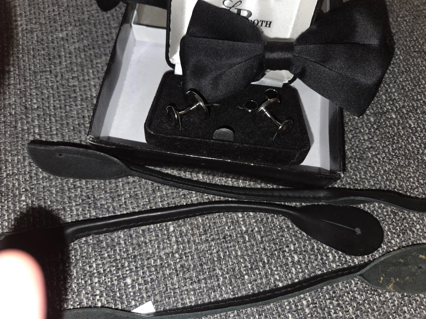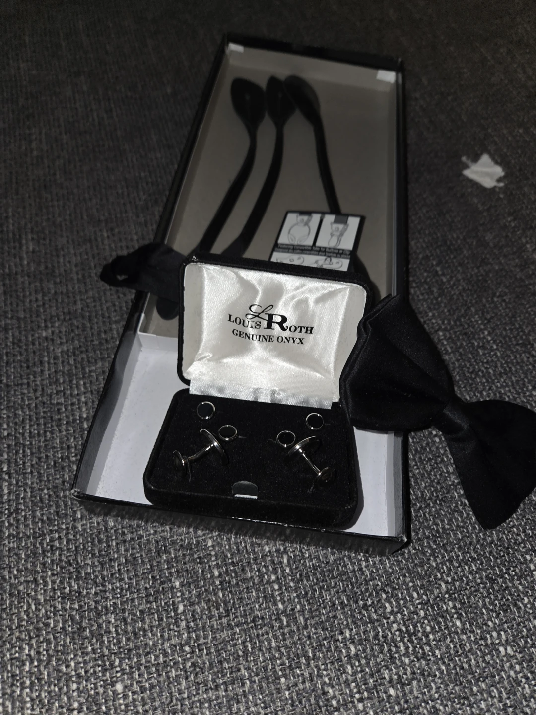 Cufflinks and typically a set of four matching tuxedo shirt studs. These are vintage and their value can vary, with similar sets selling online a Louis Roth genuine onyx cufflink and bowtie set! It comes in its original box. Perfect for formal occasions or adding a touch of class to your outfitThis is a set of Louis Roth genuine onyx cufflinks and shirt studs in their original box.