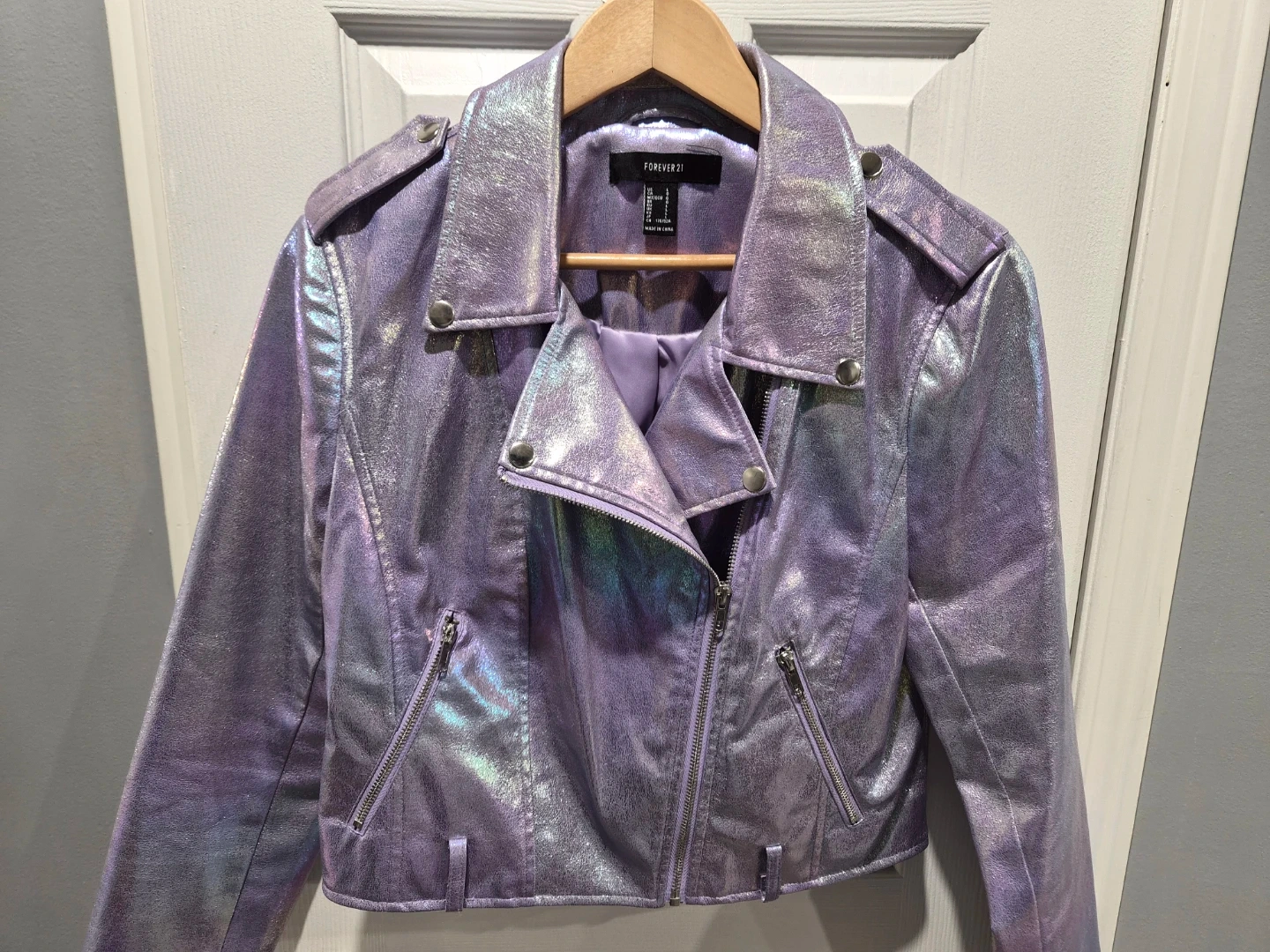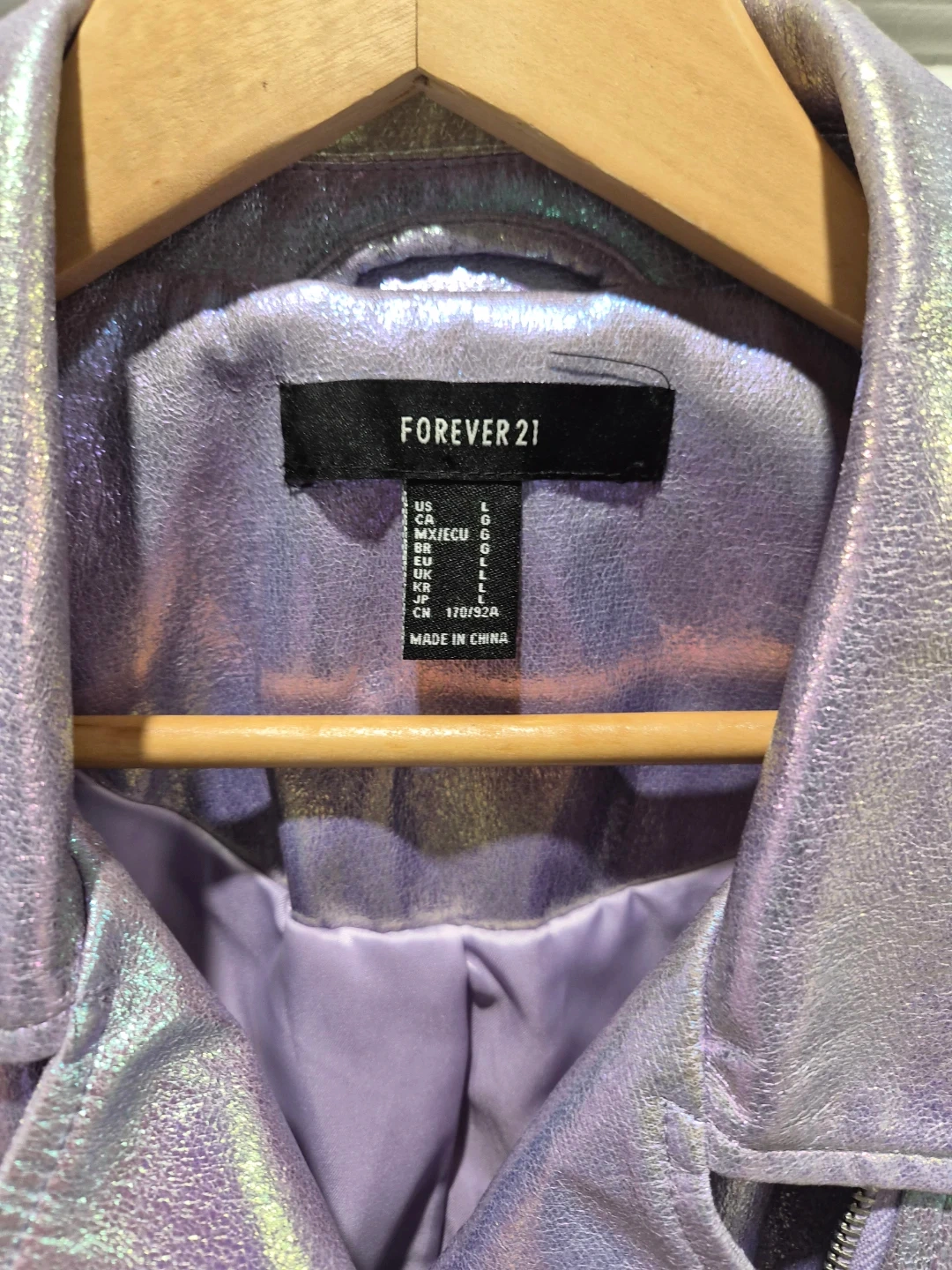 Selling a Forever 21 iridescent moto jacket in a size large! This jacket has a unique, eye-catching look. Perfect for adding some sparkle to your wardrobe