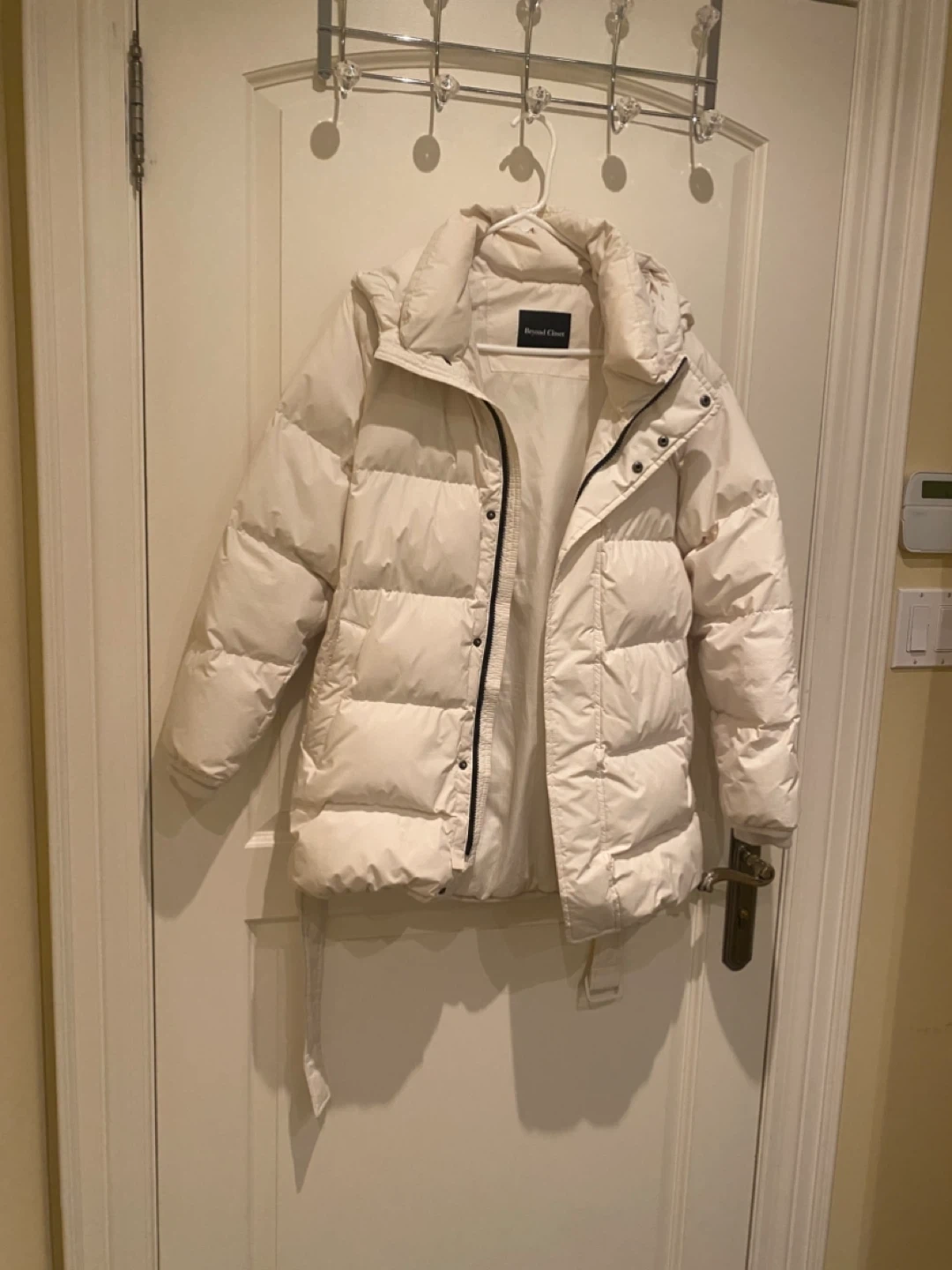 Cozy up in this Beyond Closet goose down puffer jacket! It's a stylish cream colour and features a flattering belted waist. Perfect for staying warm during those chilly Canadian days!